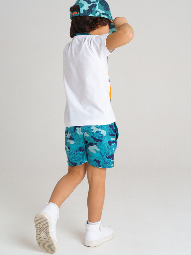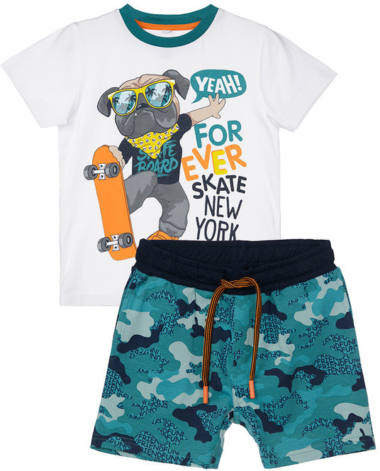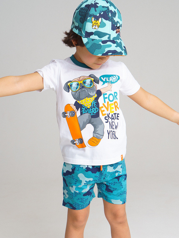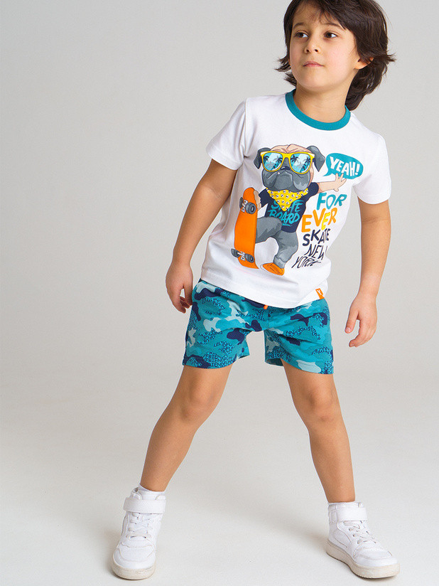 Комплект: футболка, шорты, из качественного эластичного и приятного на ощупь трикотажа джерси. Высокое содержание хлопка 95%. Благодаря наличию эластана в составе ткани изделие держит форму и меньше мнется. Эластичный пояс с тесьмой позволяет легко надевать и утягивать до идеальной посадки в зависимости от комплекции ребенка. Принт сохраняет первоначальный вид даже после многочисленных стирок