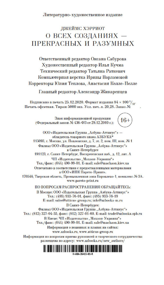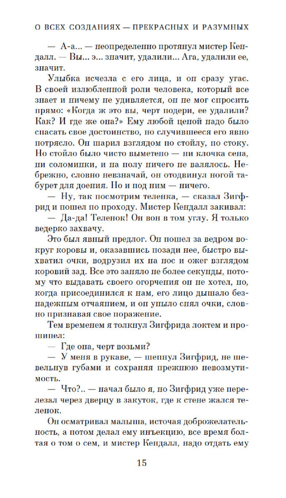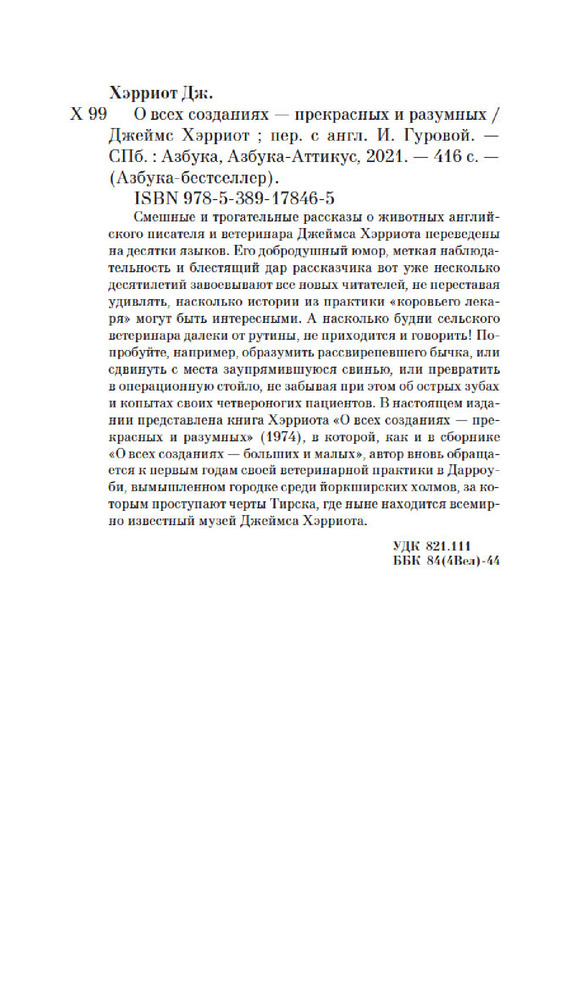 О всех созданиях — прекрасных и разумныхВ данный момент этот товар отсутствует в продаже. Возможно, у нас найдется аналогичный или похожий товар здесь. Серия: Азбука-бестселлер Смешные и трогательные рассказы о животных английского писателя и ветеринара Джеймса Хэрриота переведены на десятки языков. Его добродушный юмор, меткая наблюдательность и блестящий дар рассказчика вот уже несколько десятилетий завоевывают все новых читателей, не переставая удивлять, насколько истории из практики «коровьего лекаря» могут быть интересными. А насколько будни сельского ветеринара далеки от рутины, не приходится и говорить! Попробуйте, например, образумить рассвирепевшего бычка, или сдвинуть с места заупрямившуюся свинью, или превратить в операционную стойло, не забывая при этом об острых зубах и копытах своих четвероногих пациентов. |