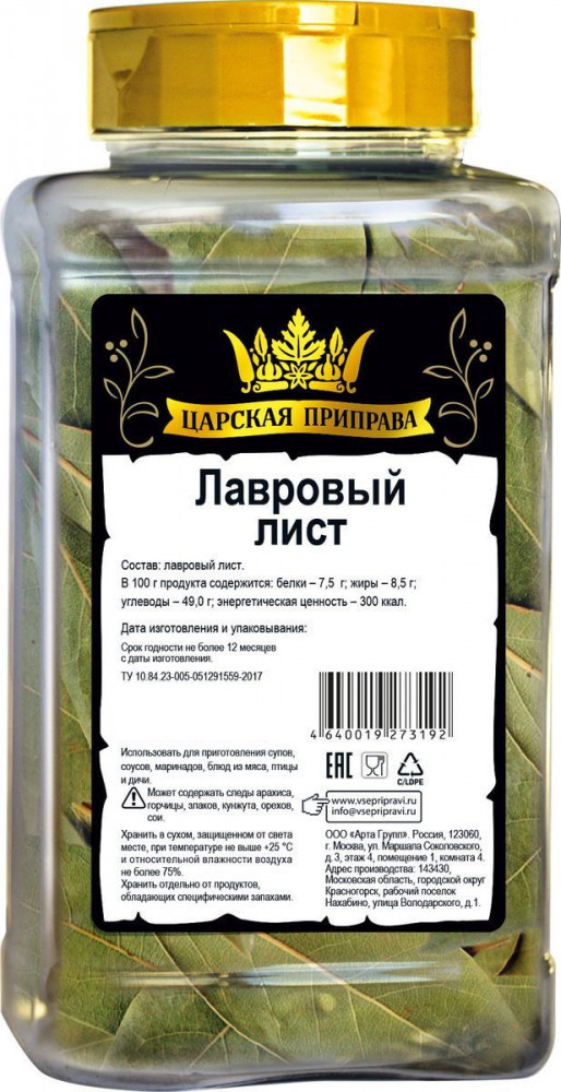 Лавровый лист очень понравился, ароматный и все листочки целые, удобная упаковка !Я убедилась, что товары марки "Царская приправа" качественные, покупала перец горошком!
