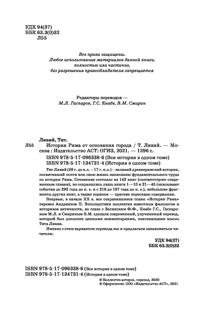 В данный момент этот товар отсутствует в продаже. Возможно, у нас найдется аналогичный или похожий товар здесь. Серия: Вся история в одном томе Тит Ливий (59 г. до н.э. — 17 г. н.э.) — великий древнеримский историк, посвятивший почти всю свою жизнь написанию фундаментального труда по истории Рима. Сочинение состояло из 142 книг (соответствуют современным главам), но сохранились лишь книги 1–10 и 21–45 (описывают события до 292 года до н. э. и с 218 до 167 года до н. э.), небольшие фрагменты других книг, а также периохи — краткие пересказы содержания.
