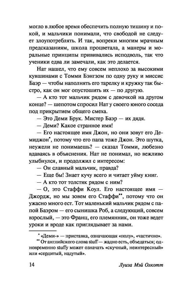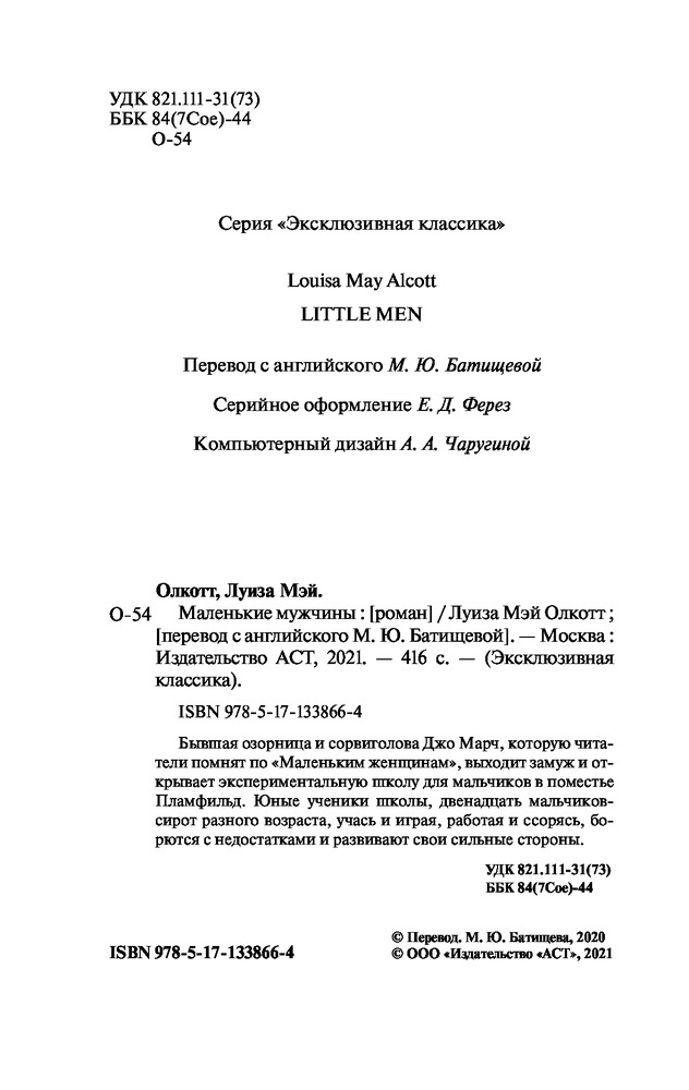 Маленькие мужчиныВ данный момент этот товар отсутствует в продаже. Возможно, у нас найдется аналогичный или похожий товар здесь. Серия: Эксклюзивная классика Бывшая озорница и сорвиголова Джо Марч, которую читатели помнят по «Маленьким женщинам», выходит замуж и открывает экспериментальную школу для мальчиков в поместье Пламфильд. Юные ученики школы, двенадцать мальчиков-сирот разных возрастов, учась и играя, работая и ссорясь, борются с недостатками и развивают свои сильные стороны. |