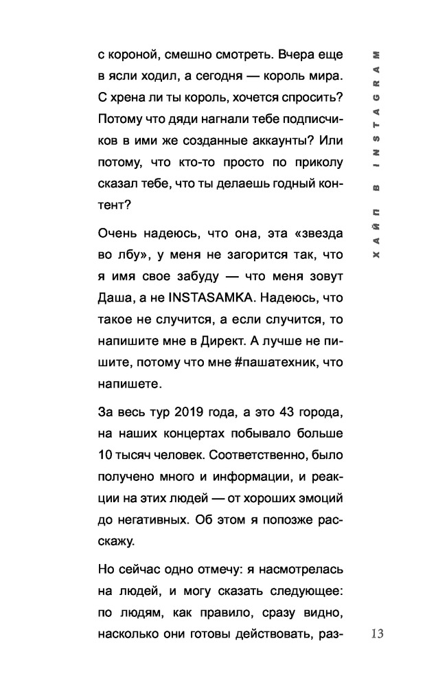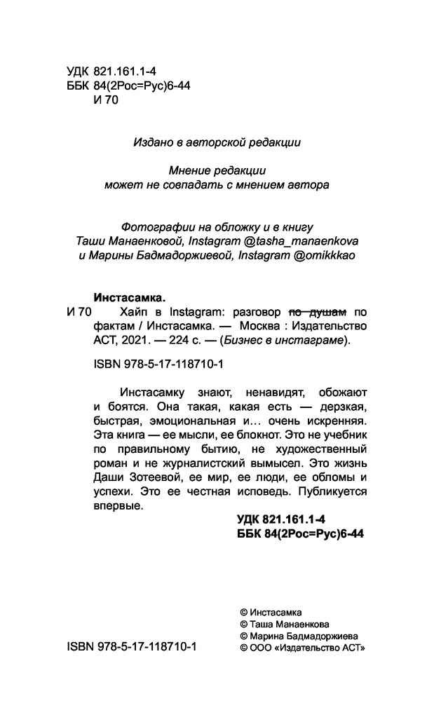 Хайп в Instagram: разговор по фактамВ данный момент этот товар отсутствует в продаже. Возможно, у нас найдется аналогичный или похожий товар здесь. Серия: Бизнес в инстаграме Инстасамку знают, ненавидят, обожают и боятся. Instasamka такая, какая есть — дерзкая, быстрая, эмоциональная и... очень искренняя. Эта книга — ее мысли, ее блокнот. Это не учебник по правильному бытию, не художественный роман и не журналистский вымысел. Это жизнь Даши Зотеевой, ее мир, ее люди, ее обломы и успехи. Это ее честная исповедь. Публикуется впервые. |