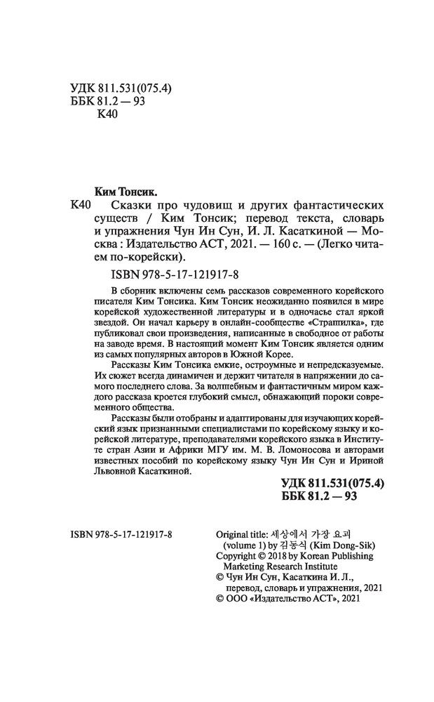 💳 Оплатить за товар можно при получении 🇰🇿 Есть бесплатная доставка по Казахстану 🎁 Копите бонусы с каждой покупки Серия: Легко читаем по-корейски В сборник включены семь рассказов современного корейского писателя Ким Тонсика. Ким Тонсик неожиданно появился в мире корейской художественной литературы и в одночасье стал яркой звездой. Он начал карьеру в онлайн-сообществе «Страшилка», где публиковал свои произведения, написанные в свободное от работы на заводе время. В настоящий момент Ким Тонсик является одним из самых популярных авторов в Южной Корее. |