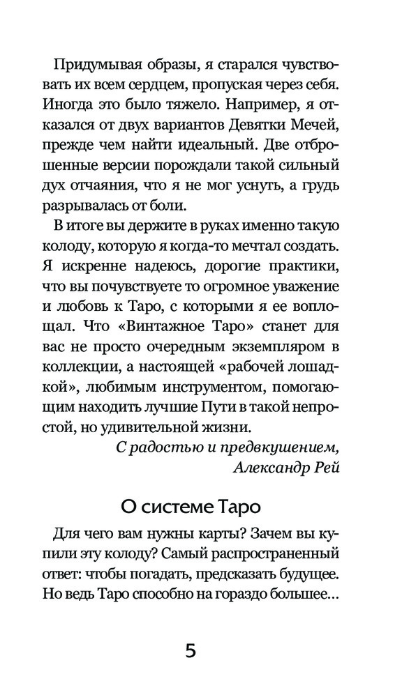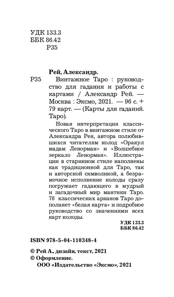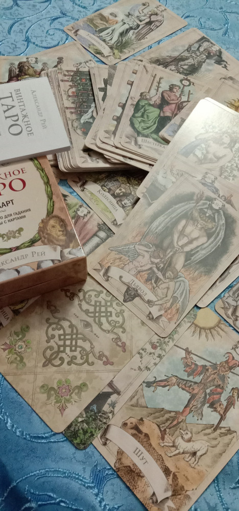 Винтажное Таропрорисовка ламинированные легко читаются инструкция В данный момент этот товар отсутствует в продаже. Возможно, у нас найдется аналогичный или похожий товар здесь. Серия: Карты для гаданий. Таро Новая интерпретация классического Таро в винтажном стиле от Александра Рея, автора полюбившихся читателям колод «Оракул мадам Ленорман» и «Волшебное зеркало Ленорман»! Иллюстрации в старинном стиле, наполнены как традиционной для Таро, так и авторской символикой, а безрамочное исполнение колоды сразу погружают гадающего в мудрый и загадочный мир мантики Таро. 78 классических арканов Таро дополняет «белая карта» и подробное руководство со значениями всех карт колоды. |