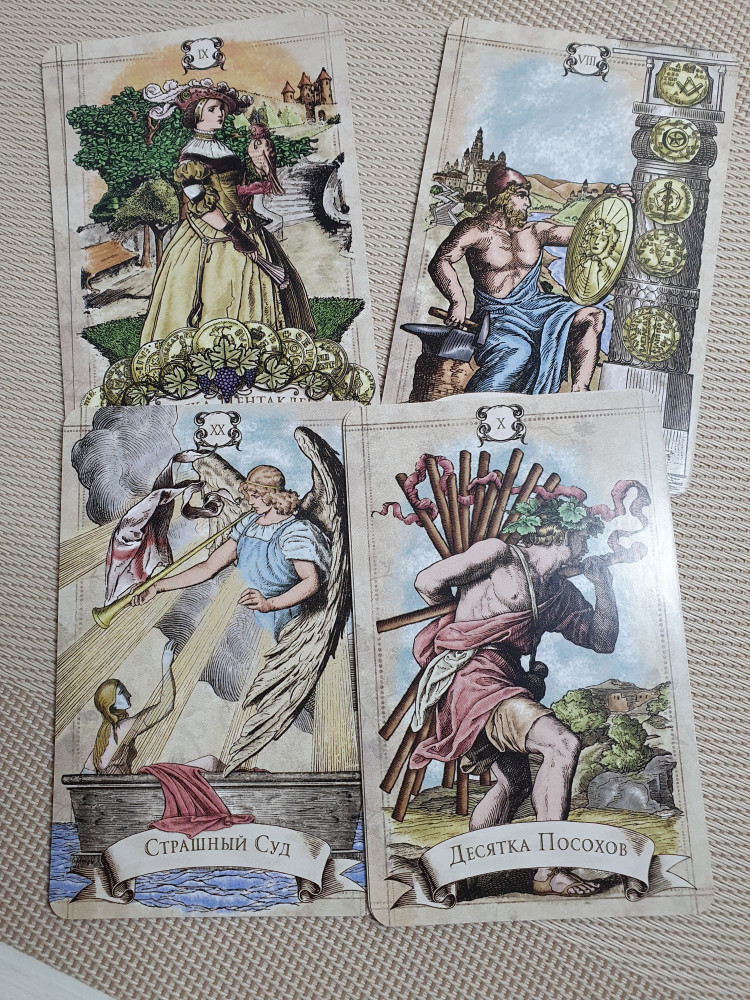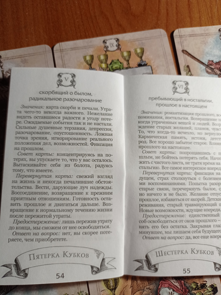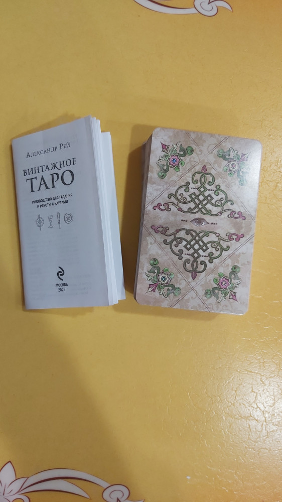 Карты за такую цену просто находка. Отличного качества, картон плотный, прорисовка это отдельная тема для разговора и я могу ей только восхищаться. Отдельные карты, для кого это важно, немного отличаются от классики Уэйта, это 5 жезлов, 7 мечей, 5 кубков, 8 мечей, но для меня лично - это приятная изюминка при работе на данном инструменте. МБК достойное дополнение к данной колоде, есть описание прямых и перевёрнутых позиций. К покупке однозначно рекомендую.