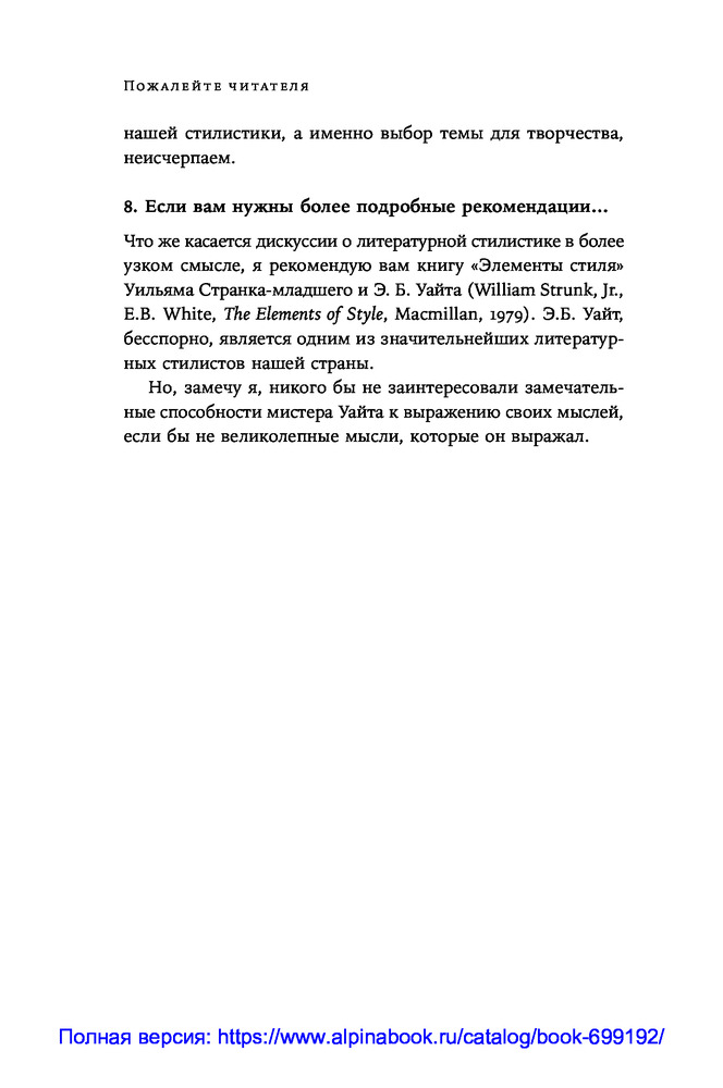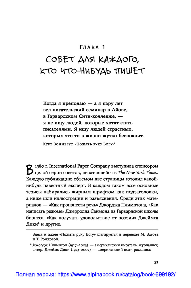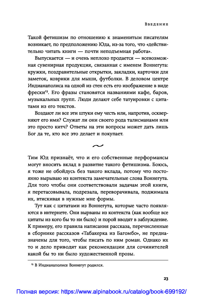 Остроумные и язвительные рекомендации Воннегута, взятые из его романов, эссе, лекций, статей, интервью и писем, с подробными комментариями Сьюзен Макконнелл вдохновят каждого, кто выбрал писательский путь. Они помогут понять, о чем и для кого писать, где отыскивать истории и как не пропасть в омуте творческого ступора и страха. «Пожалейте читателя» — полезное руководство для начинающих авторов и отличный подарок всем поклонникам творчества Курта Воннегута. |