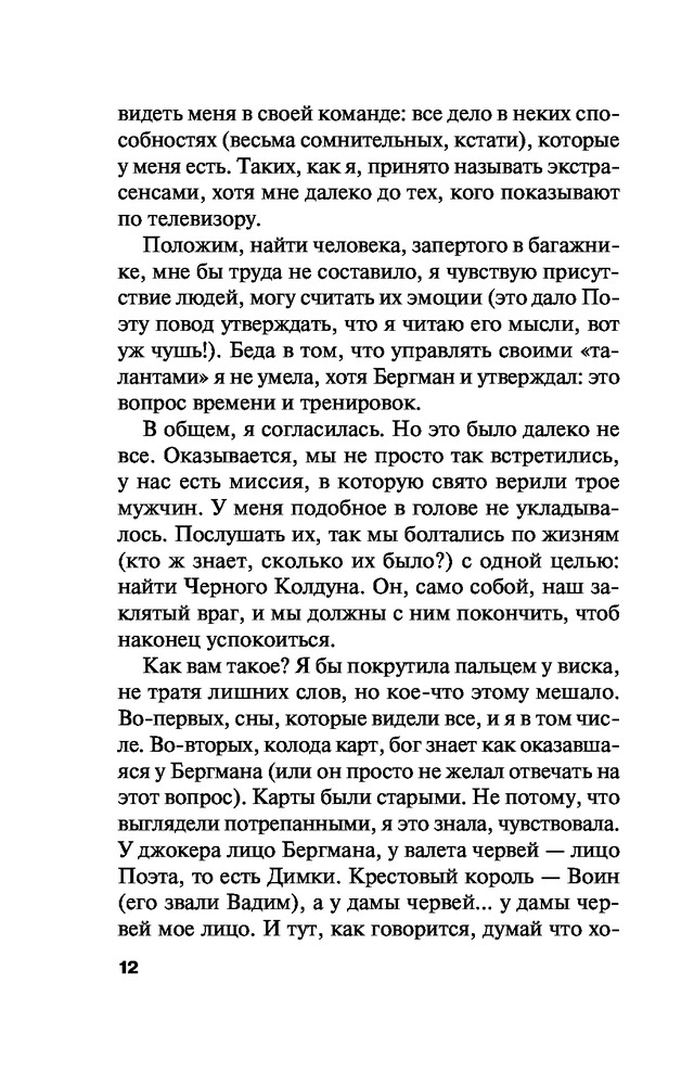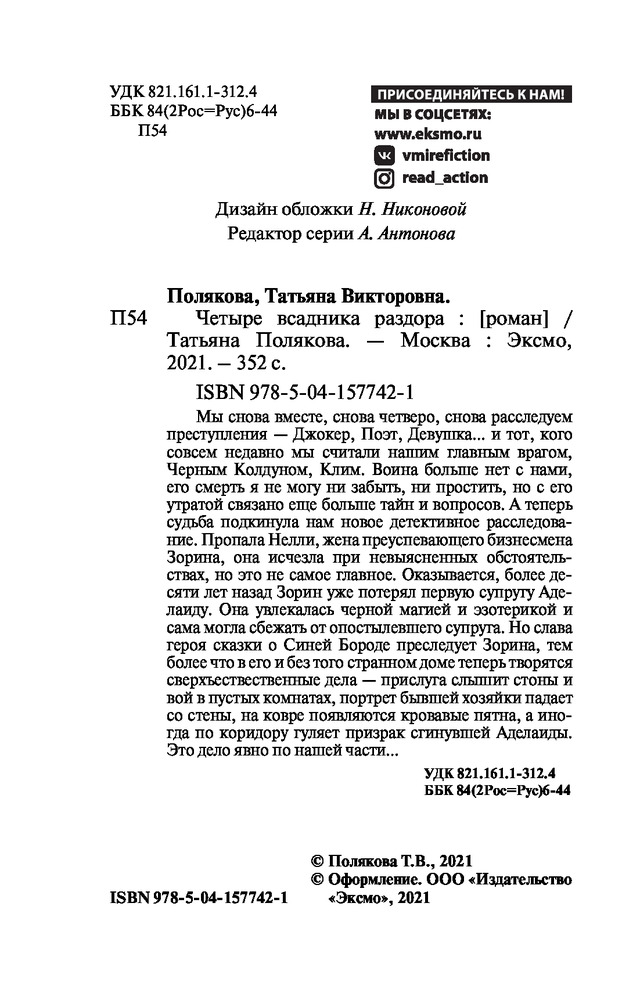 Четыре всадника раздораВ данный момент этот товар отсутствует в продаже. Возможно, у нас найдется аналогичный или похожий товар здесь. Серия: Авантюрный детектив. Романы Т. Поляковой (обложка) Мы снова вместе, снова четверо, снова расследуем преступления — Джокер, Поэт, Девушка... и тот, кого совсем недавно мы считали нашим главным врагом, Черным Колдуном, Клим. Воина больше нет с нами, его смерть я не могу ни забыть, ни простить, но с его утратой связано еще больше тайн и вопросов. А теперь судьба подкинула нам новое детективное расследование. Пропала Нелли, жена преуспевающего бизнесмена Зорина, она исчезла при невыясненных обстоятельствах, но это не самое главное. Оказывается, более десяти лет назад Зорин уже потерял первую супругу Аделаиду. Она увлекалась черной магией и эзотерикой, и сама могла сбежать от опостылевшего супруга. Но слава героя сказки о Синей Бороде преследует Зорина, тем более что в его и без того странном доме теперь творятся сверхъественные дела — прислуга слышит стоны и вой в пустых комнатах, портрет бывшей хозяйки падает со стены, на ковре появляются кровавые пятна, а иногда по коридору гуляет призрак сгинувшей Аделаиды. Это дело явно по нашей части... |