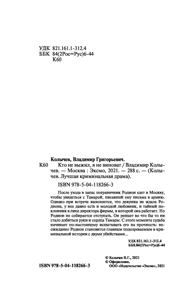💳 Оплатить за товар можно при получении 🇰🇿 Есть бесплатная доставка по Казахстану 🎁 Копите бонусы с каждой покупки Серия: Колычев. Лучшая криминальная драма После ухода в запас пограничник Родион едет в Москву, чтобы увидеться с Тамарой, писавшей ему письма в армию. Однако при встрече выясняется, что девушка не ждала Родиона, у нее давно есть и молодой любовник, и тайный поклонник в лице директора фирмы, в которой она работает. Но Родион не собирается отступать. Он решает во что бы то ни стало добиться руки и сердца Тамары. С этого момента судьба начинает по-настоящему испытывать его на прочность: неожиданно Родион становится главным подозреваемым в криминальной истории с двумя убийствами... |
