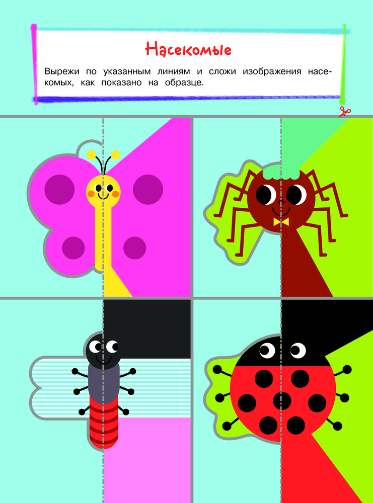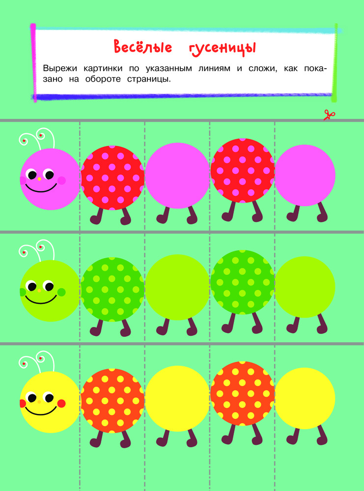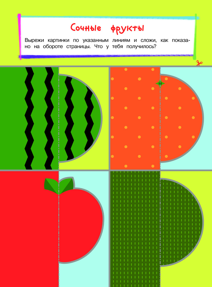 Выполняя разнообразные занимательные задания, ребенок вырежет по линиям и соберёт цыплёнка, крокодила, льва, пингвина и других животных; сделает вкусный шашлык; испечёт клубничный торт; побывает на рыбалке; покатается на детской горке, проведёт время весело и интересно. Замечательные добрые картинки повысят интерес ребенка к занятиям, а доступность заданий придаст уверенности в себе.