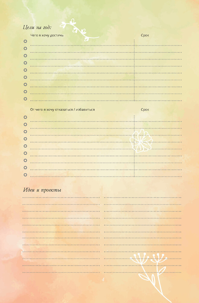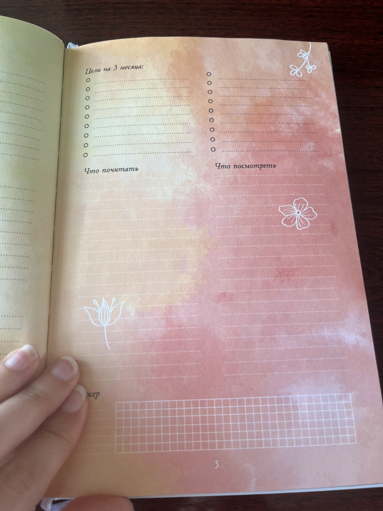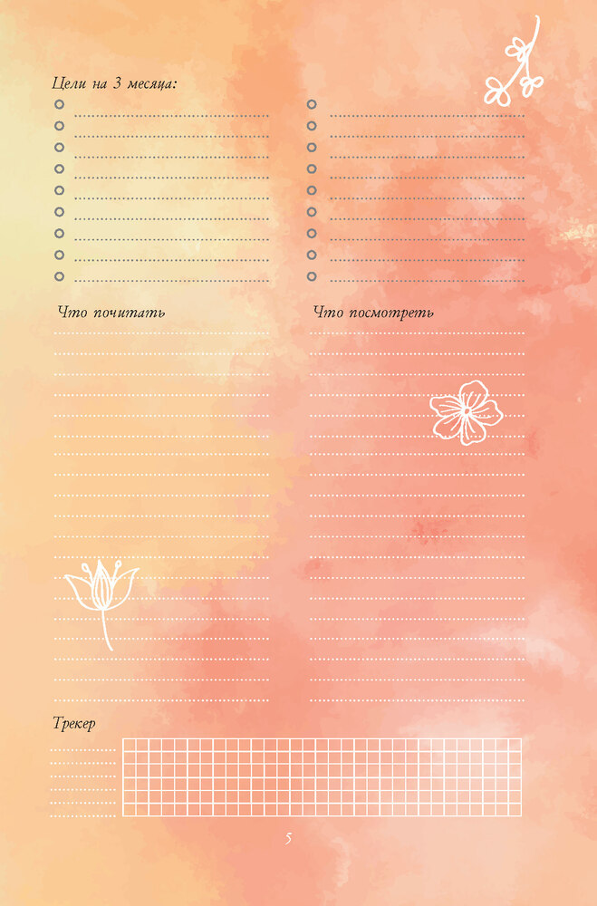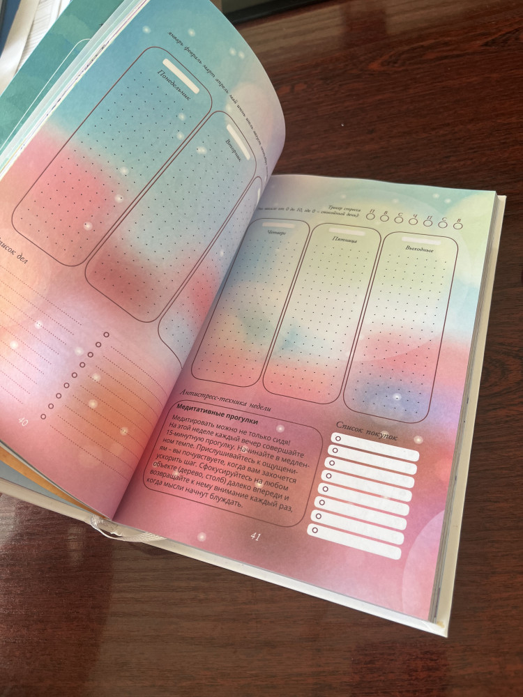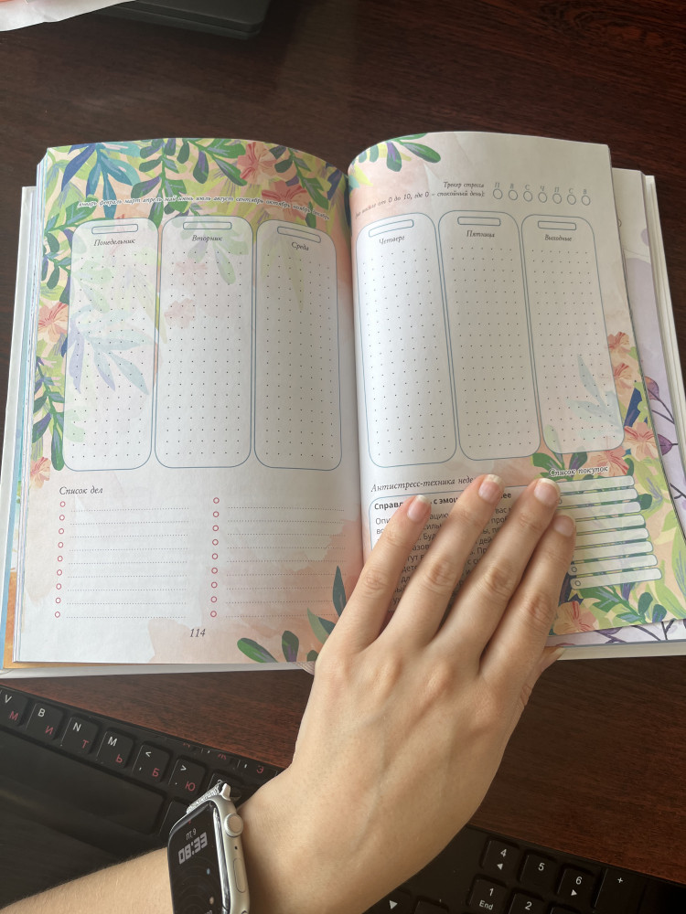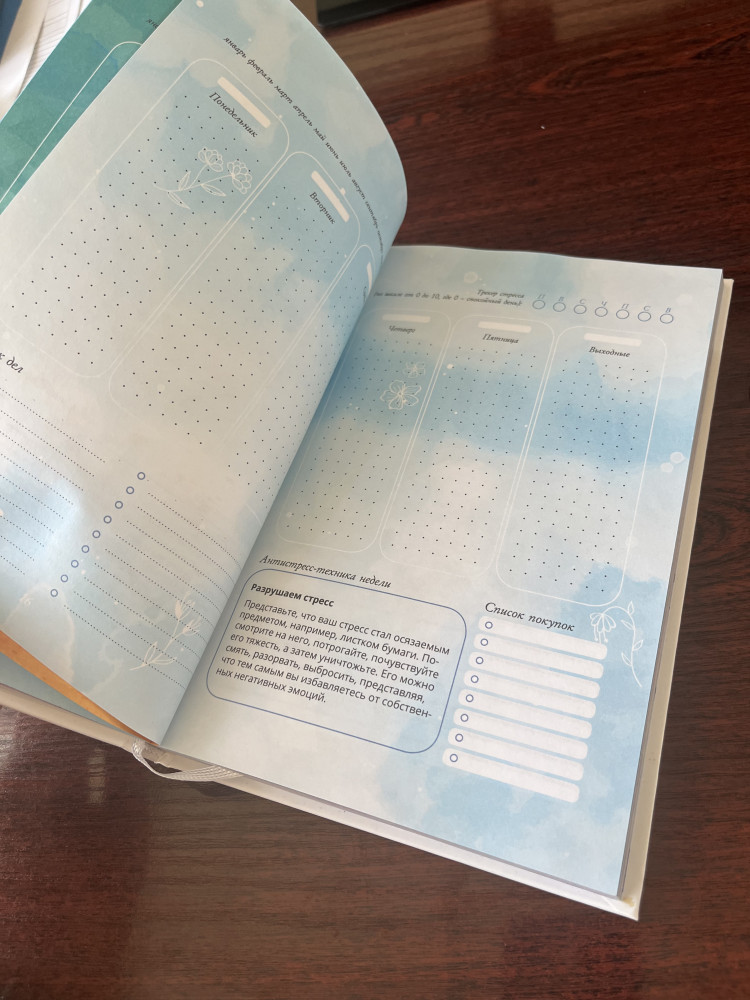 В конце еженедельника вас ждут полезные бонусы: дневник эмоций, шаблон плана заботы о себе на неделю, разнообразные списки и практические планы по улучшению своего внутреннего состояния.
