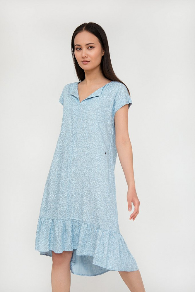 Стильное платье выполнено из вискозы. Изделие расклешенного покроя с карманами, рукава короткие. Отличный вариант на каждый день!