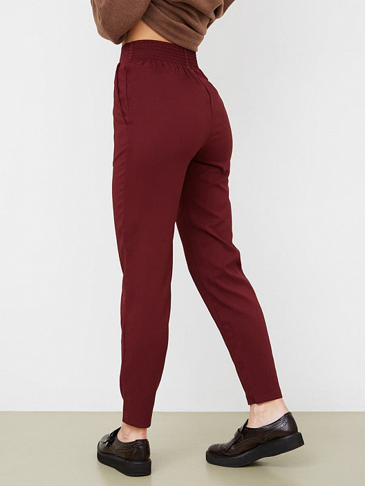 Брюки женские выполнены из текстиля. Полуприлегающего силуэта, слегка заужены к низу. С высокой посадкой. Пояс широкий. По спинке в пояс вставлена эластичная тесьма. На детали переда карманы с отрезным бочком. Фактура: тканое полотно.