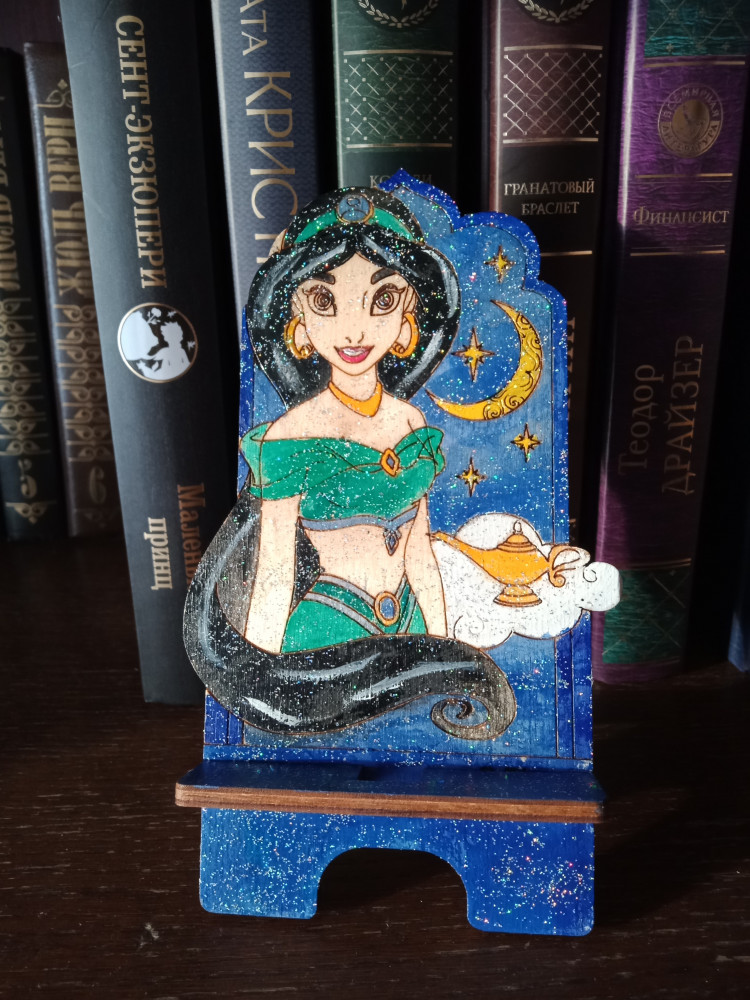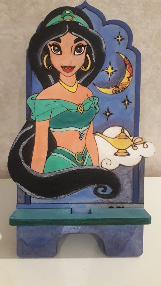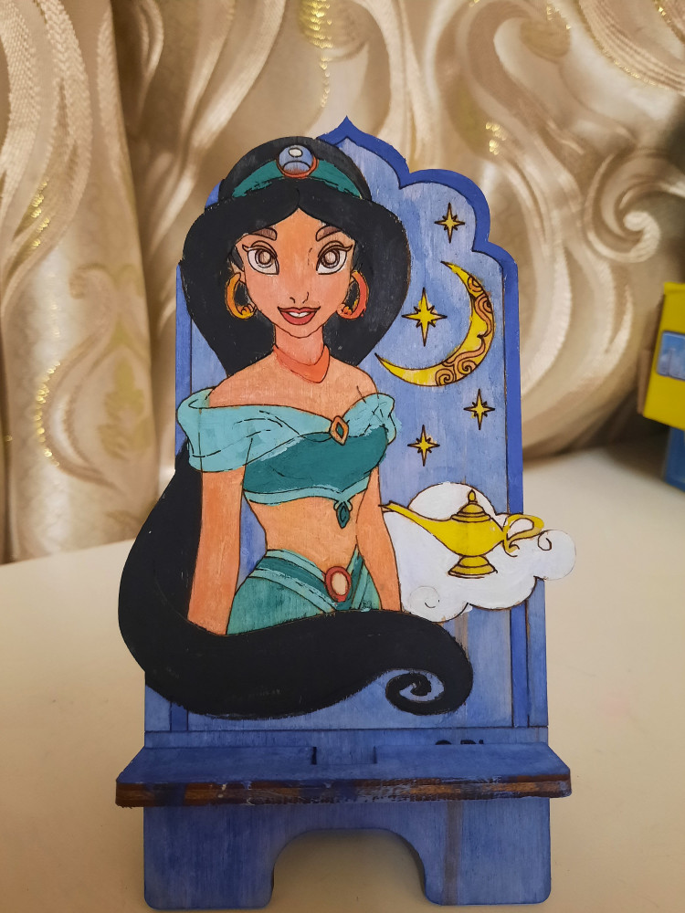 Подставка для телефона заказала 2 шт (русалочка Ариель и Жасмин): -Деревянная подставка из 2 частей -гуашь 6 цветов -Кисть Для ребёнка 5 лет, оказалось сложновато, маленькие элементы (глаза, губы и др). Старшая дочь 7лет справилась с раскрашиванием легко, занятие увлекло на несколько часов! Получилось красиво! Теперь нужно придумать, чем покрыть сверху,нужен какой то прозрачный лак, чтобы закрепить краску и защитить от случайного попадания воды!