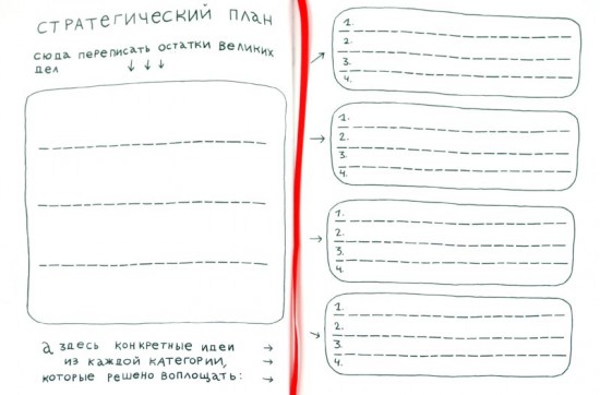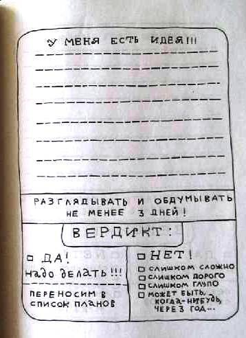 Это дневник действительно только для очень творческих людей. Людям собранным, пунктуальным и очень деловым ежедневник не понравиться – много лишних страниц, но при этом нет вкладок с картой страны и кодами городов всего мира, разметка непривычная и ваще. Главный плюс ежедневника – юмор. Планирование рабочего дня, следование планам… На самом деле все это смертельно скучно, но не в нашем случае. Например, есть раздел «Остатки великих дел» – это то, что мы не доделали или отложили на завтра. Или вот – «У меня есть идея» – сюда можно записать что-то, если вас осенило, но обдумать все как следует можно и попозже. Есть даже страничка, где можно себя немного пожалеть, а остальных немного поругать, а потом опять за работу с новыми силами. Страницы можно вырывать, вырезать и т. д. Здорово, по-моему, ведь только единицы очень творческих людей и нуль очень деловых могут самостоятельно планировать день, анализировать потраченное время и оптимизировать затраты в будущем, не превращаясь в роботов и зануд. ЗЫ: фото внутренних страниц дневника – http://www.labirint.ru/screenshot/goods/251387/41/#1