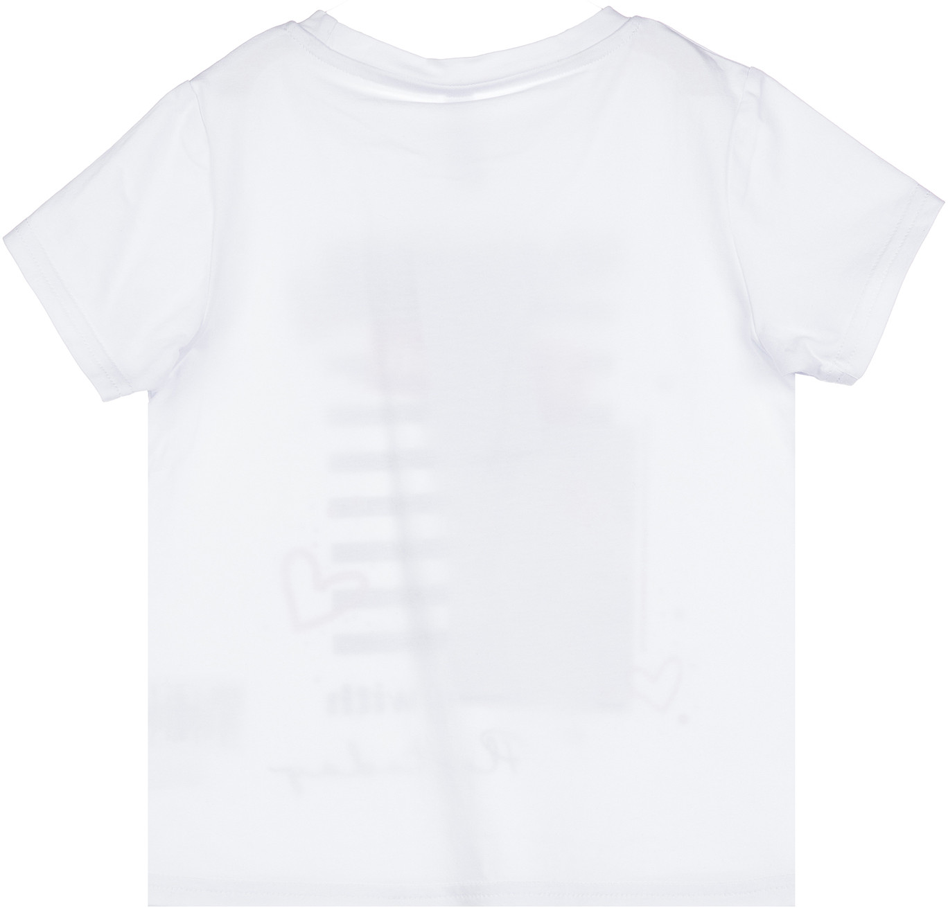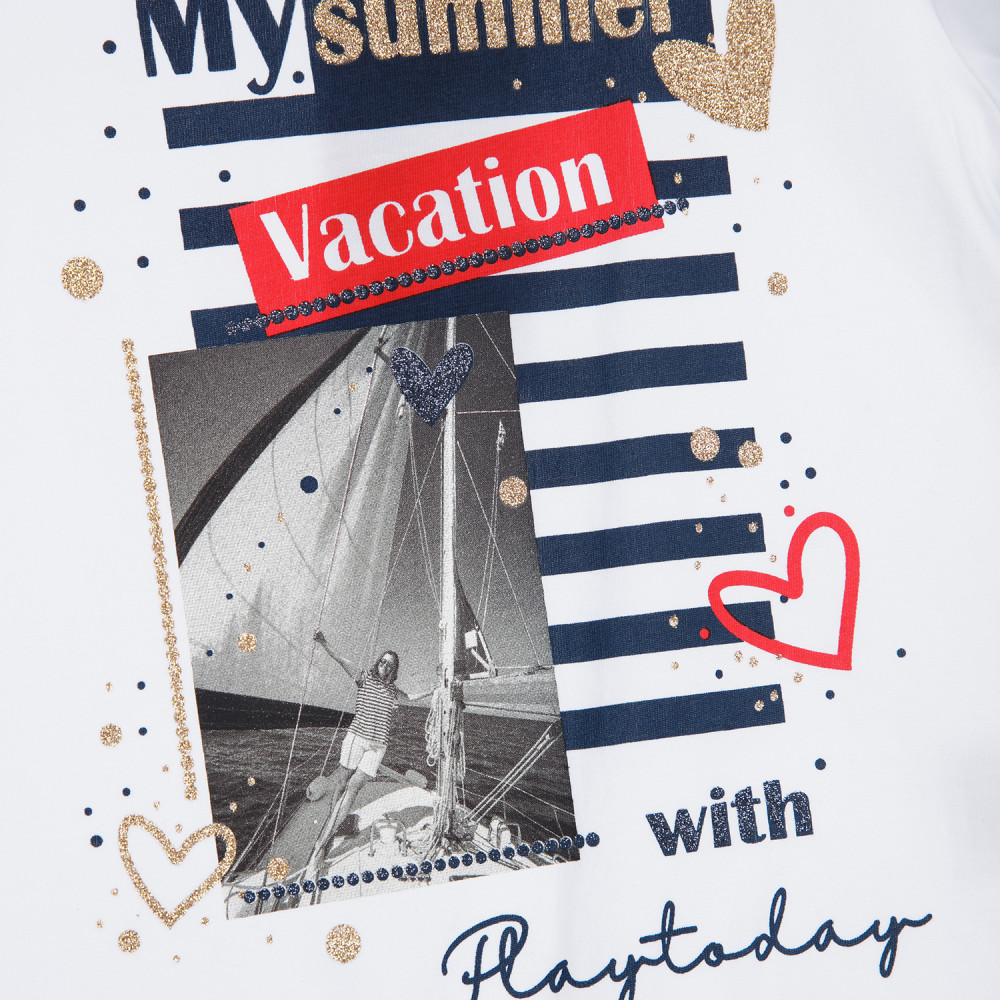 Футболка яркая, очень хорошо в комплекте с шортиками в синюю полоску. Я сначала приобрела шортики, на фото модель была в данной футболочке, потом заказала футболку. Получился отличный комплект. Рекомендую к покупке.