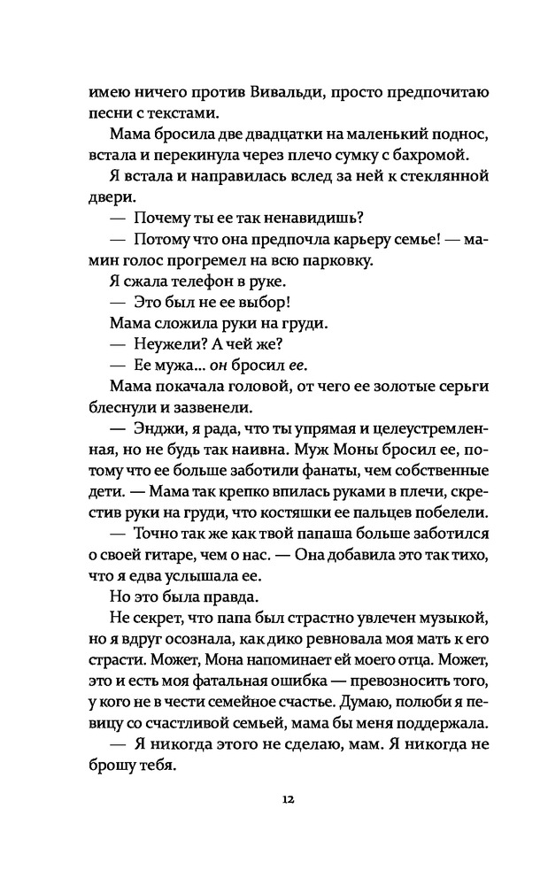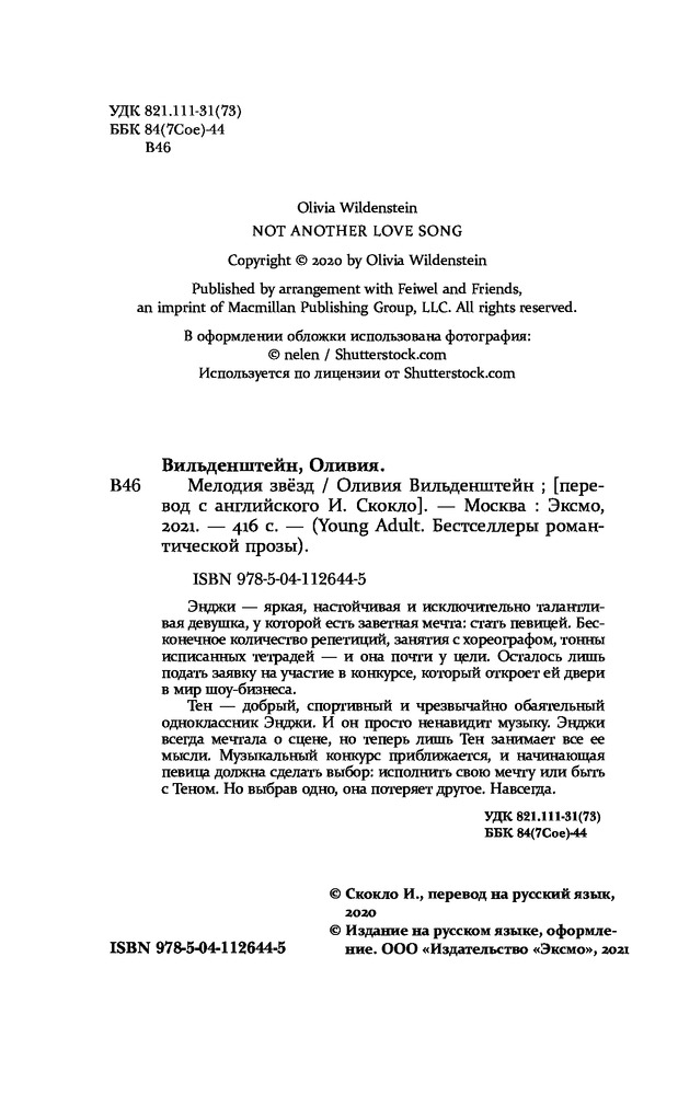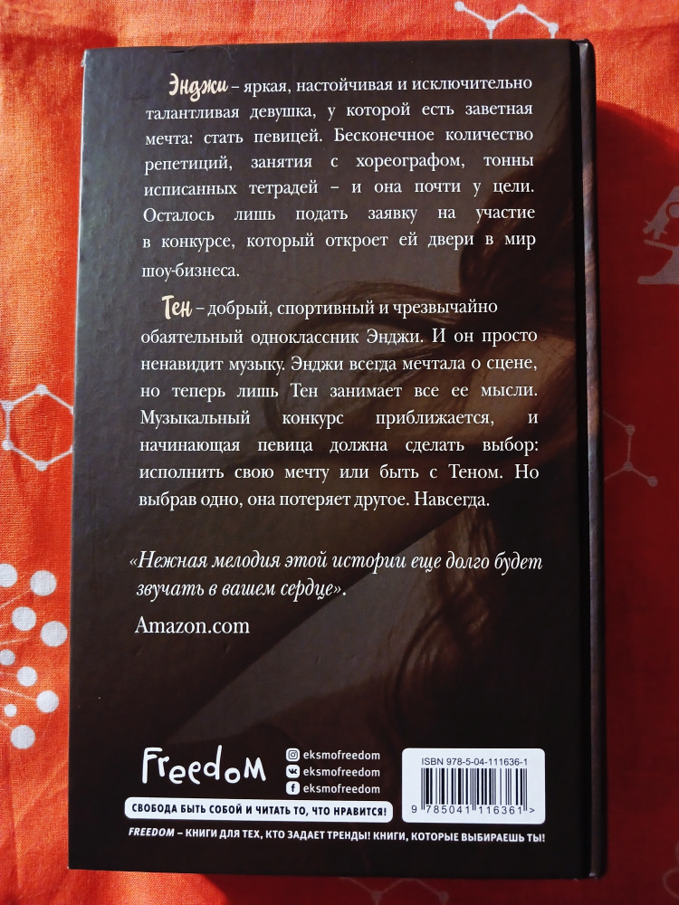 «Мелодия звёзд», Оливия Вильденштейн (“Not another love song”, Olivia Wildenstein) 🎹🎶❤ Количество страниц: 416 «Для всех молодых мечтателей, тех, кто осмеливается хотеть чего-то недосягаемого». «Глубоко вздохнув, я положила пальцы на клавиши пианино и позволила своему творению вырваться из меня. Мелодия начиналась медленно и тихо, но затем ускорялась и становилась громче, ритм бился и пенился, буквально окрашивая гостиную во флуоресцентные розовые и желтые тона, подсвечивая сам воздух». Интересно, как наш музыкант воспринимает музыку. Наверное, автор сама описывает свои личные ощущения. Я скорее воспринимаю музыку образами. Хорошая книга, но перевод мог бы быть и лучше. Я уже не говорю об опечатках. Тем не менее, советую всем любителям музыки, как я. Считаю основной лейтмотив этого романа-прозы именно любовь к музыке. О своём желании и стремлении заниматься любимым делом и найти для себя оптимальный вариант реализации своей мечты. Также автор поднимает тему взаимоотношений в семье. О том, что родители могут что-то посоветовать, но свой путь выбираешь именно ты. У главной героини Энджи как раз есть некоторые недопонимания и разногласия по этому поводу с мамой. Джейд, конечно, желает для дочери самого лучшего, но всё-таки очень обидно за девушку. Должно быть, такое неверие родительницы очень расстраивает. Творчество дочери мама больше воспринимает как хобби, а не что-то серьезное и по-настоящему важное для её ребёнка. Она хочет, чтобы дочь получила более денежную и стабильную профессию. Вероятно на такое противостояние повлияла судьба погибшего отца главной героини, который также был музыкантом. Настоящий кумир для Энджи – Мона Стоун, музыкант и певица, которую многие окружающие девушки недолюбливают. Эта женщина имеет отношение и к другой семье, с которой у неё всё сложно. Главная же героиня оканчивает школу и находится на перепутье – чем же дальше заниматься, да ещё неожиданно для себя влюбляется в очень классного парня, который на первый взгляд не любит музыку. Тен или Теннесси очень непрост, как оказалось. Именно его поддержка и надёжность, на мой взгляд, стала решающей. Как хорошо, когда в твоей жизни есть такой человек, когда весь мир против тебя. В его семье тоже всё не так гладко и Энджи всячески оберегает и помогает его младшей сестрёнке Нев или Неваде. Также в произведении поднимается не только тема семьи, творчества и любви, но и тема дружбы, буллинга, развода родителей и тайн прошлого. Если вы любители лёгкой, неспешной прозы с нотками любовного романа со счастливым концом, то эта книга для вас. Об издании: милая и романтичная твёрдая обложка с лаковыми вставками, светлые листы (в меру плотные), крупный шрифт (очень читабельный), средний формат книги. Издание: Москва: Эксмо, 2021. (Young Adult. Бестселлеры романтической прозы.) Freedom. Перевод на русский язык Скокло И.