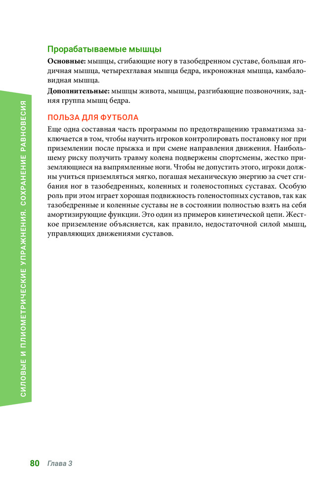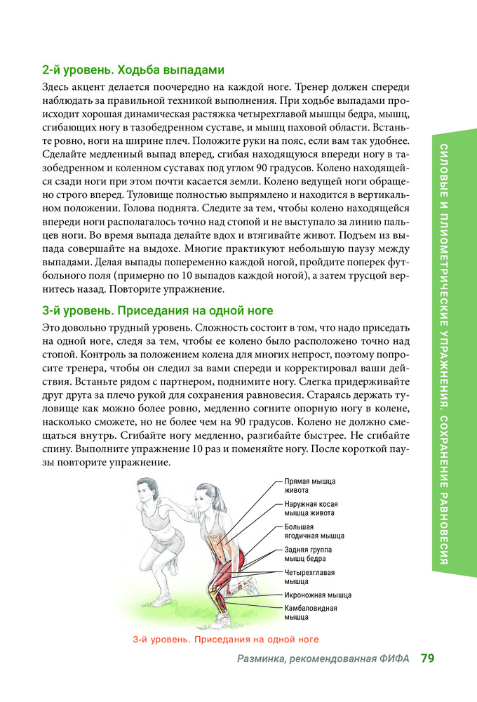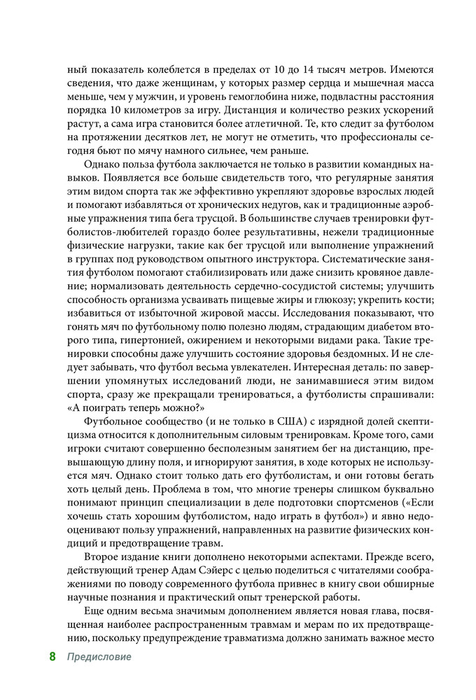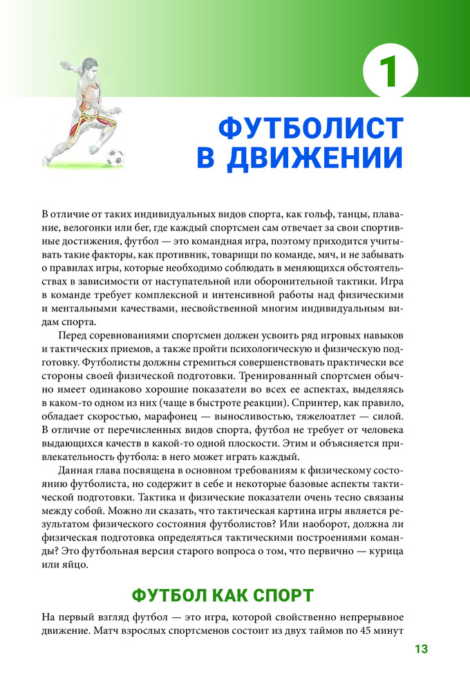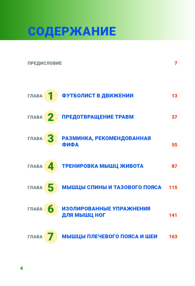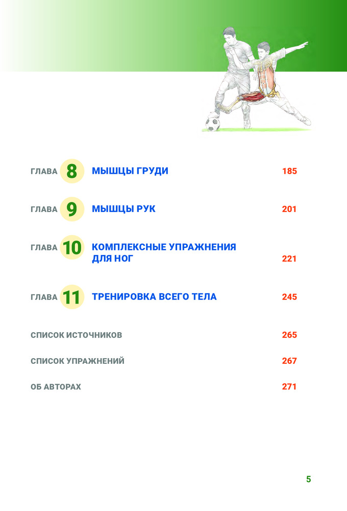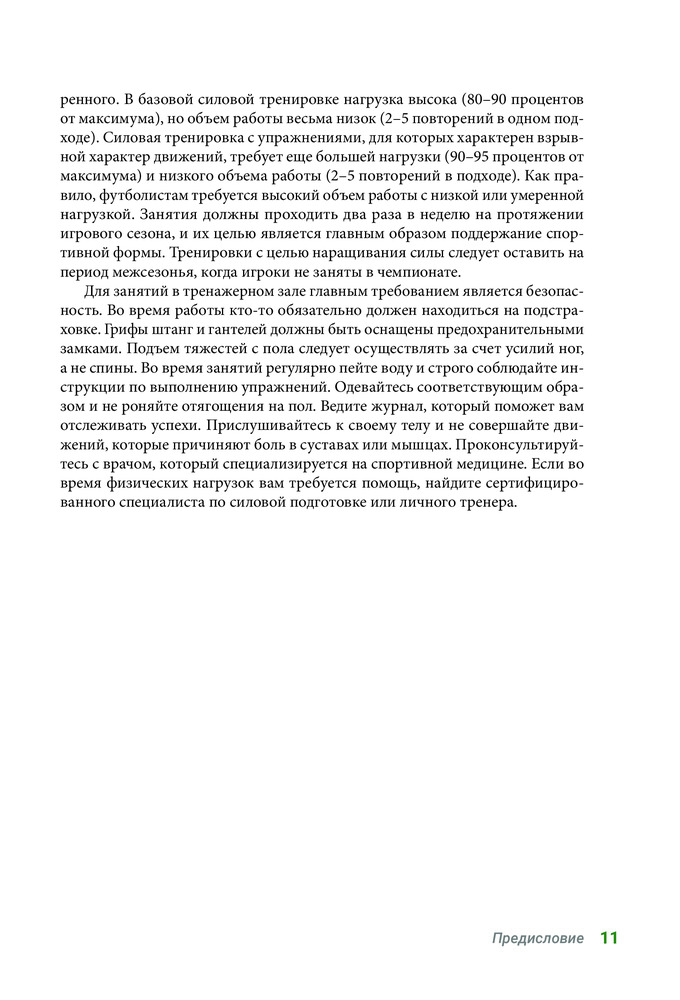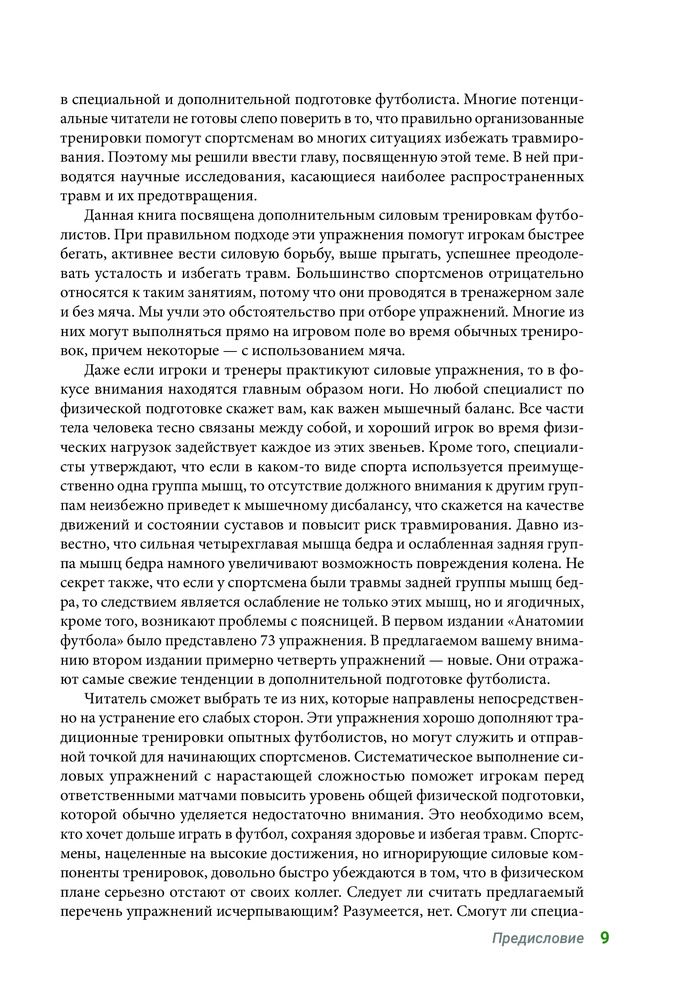 Упражнения систематизированы по разделам согласно частям тела: для мышц живота, спины и тазового пояса, плеч и шеи, рук и ног. Их варианты позволят вам сосредоточиться на определенных зонах или модифицировать базовые упражнения в соответствии со своим возрастом, спортивным опытом и тренировочными целями. Также в книге вы найдете упражнения и рекомендации, направленные на минимизацию характерных для футбола травм, в частности повреждения коленей, тазового пояса, паха, мышц бедер и голеней. Здесь приводится полная программа разминки, рекомендованная ФИФА для снижения вероятности получения распространенных травм.