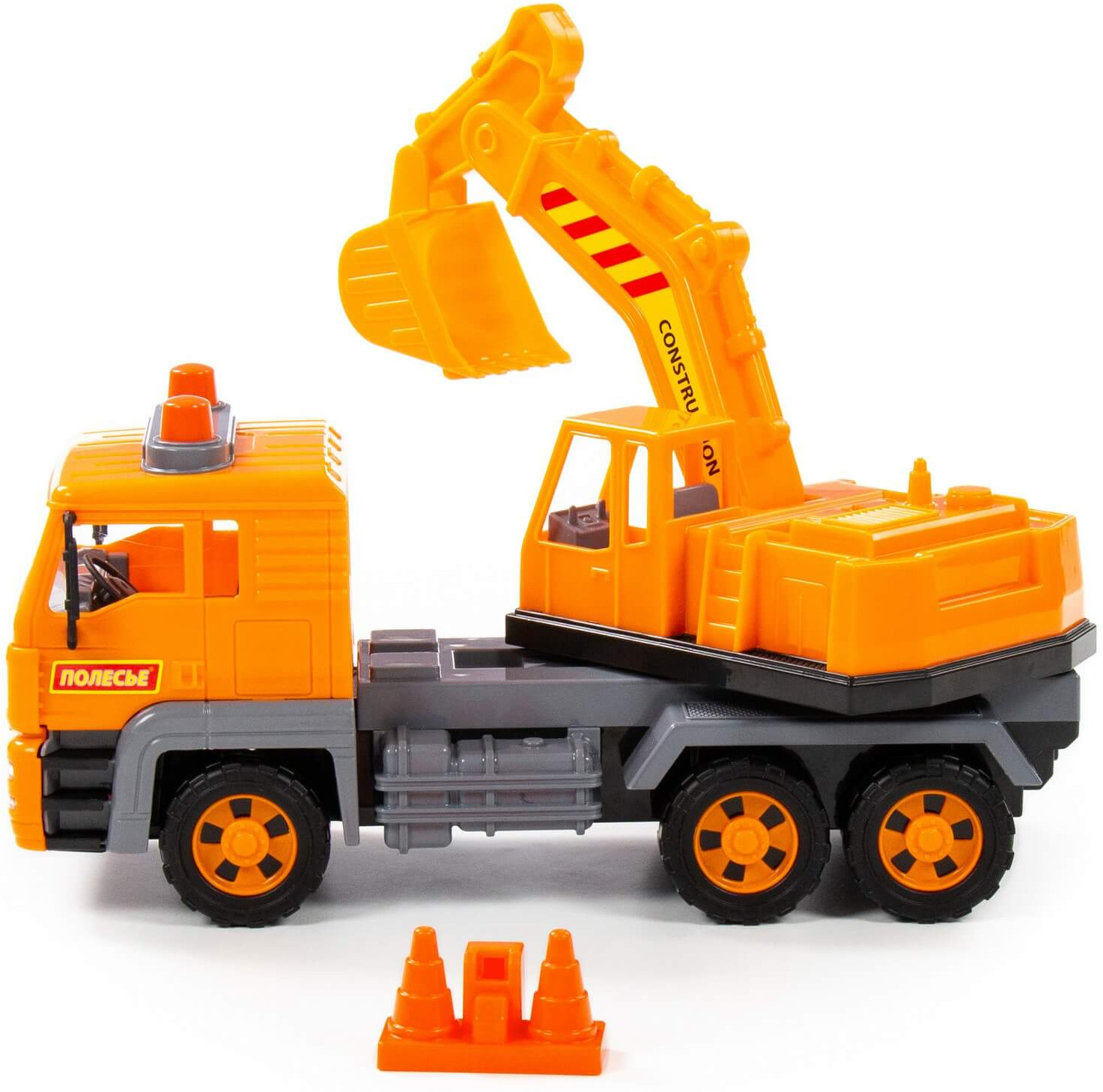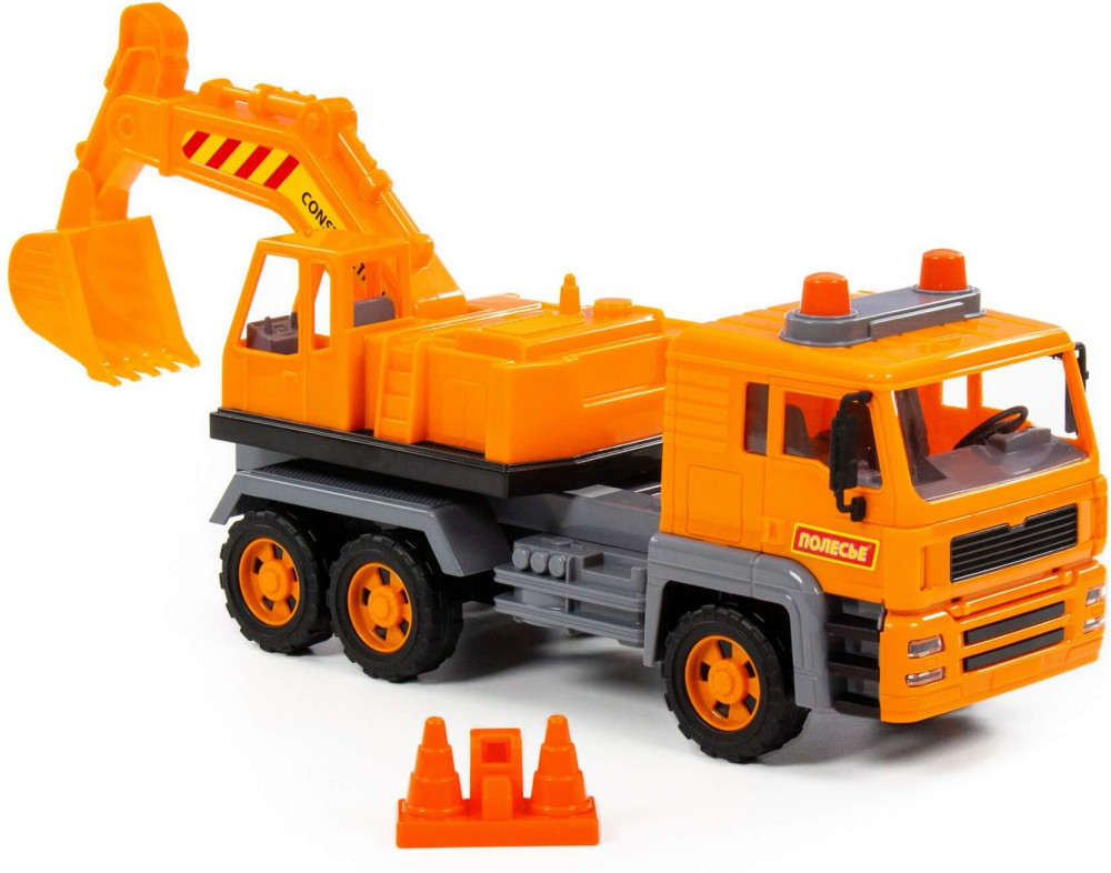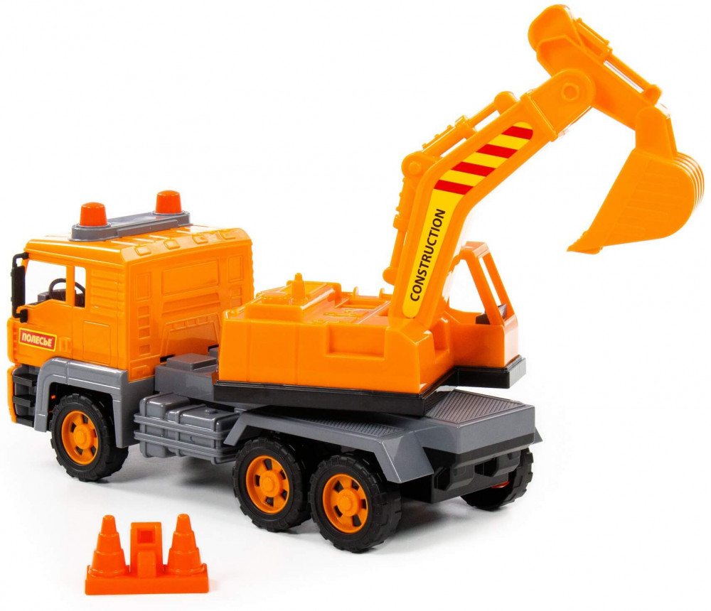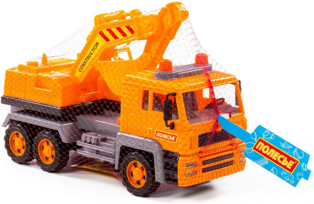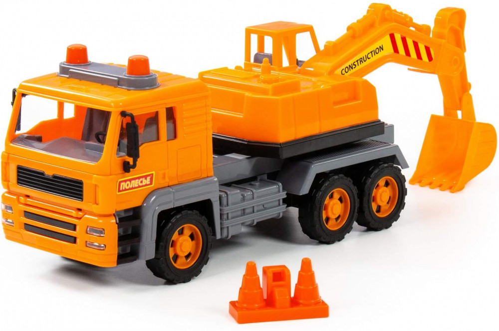 Отличный экскаватор. Размер большой, передние колёса с инерционным механизмом. Пластик прочный, впрочем у Полесье все игрушки качественные. Детали игрушки реалистичные. Экскаватор крутится.