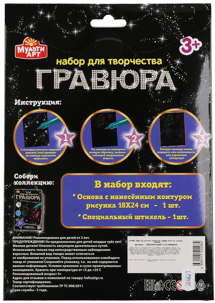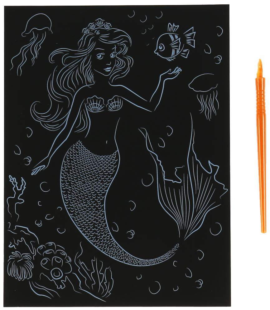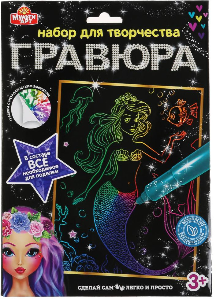 Набор для творчества «Гравюра. Русалка» ТМ «МультиАрт» — отличный подарок для ребёнка, который будет способствовать развитию его творческих способностей. С помощью данного набора юный художник сможет создать эффектную разноцветную картину с металлическим блеском на чёрном фоне. Контур рисунка уже нанесён на основу, остаётся только процарапать изображение специальным штихелем. Готовую поделку можно подарить близким или использовать для украшения интерьера.