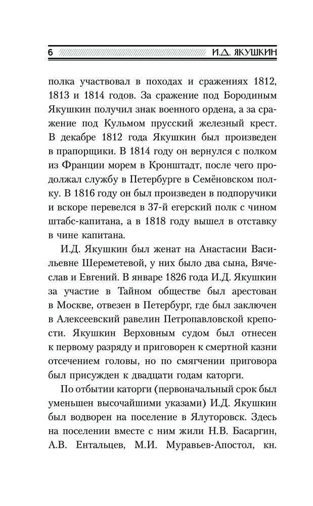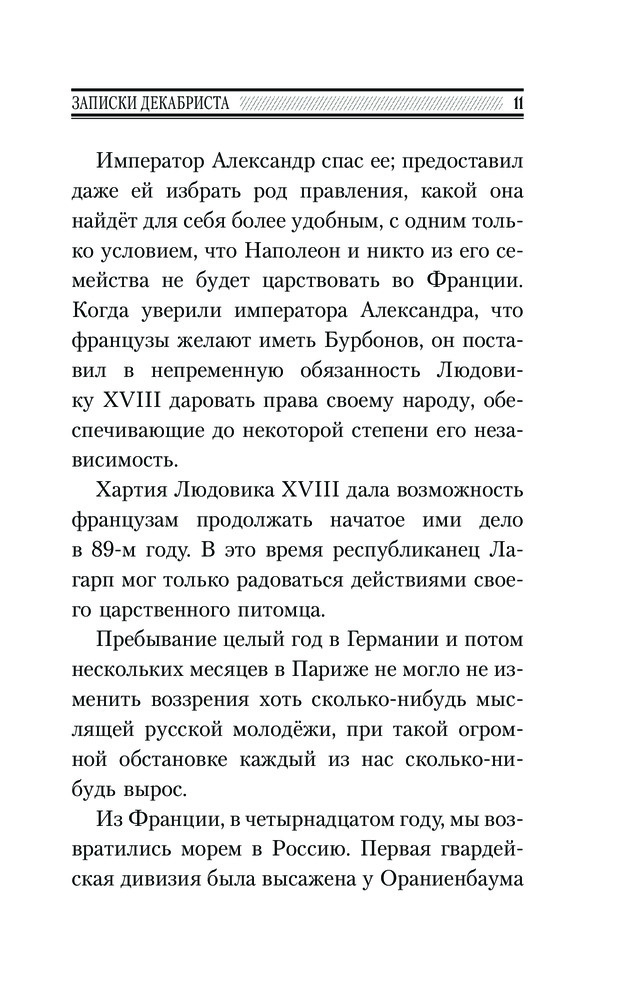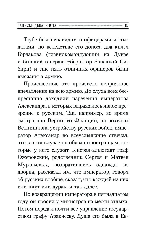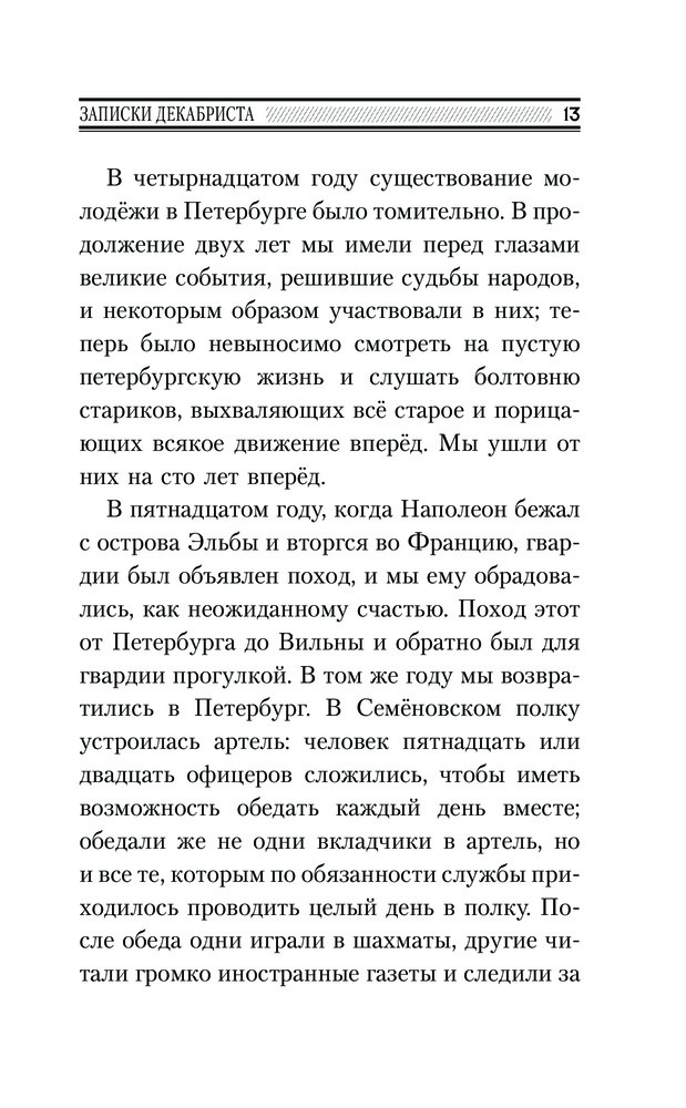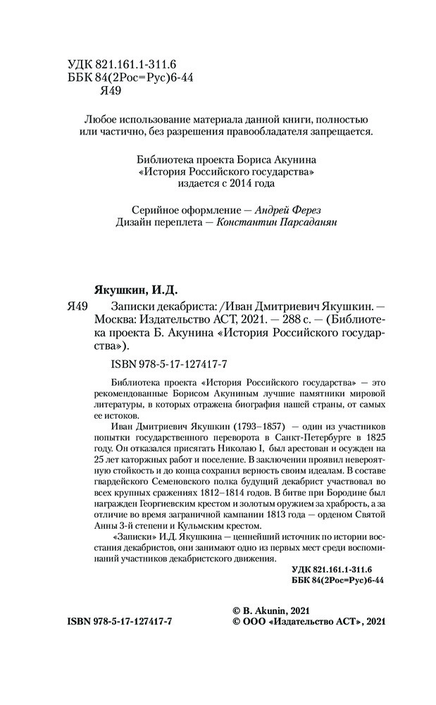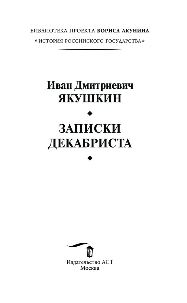 Записки декабристаВ данный момент этот товар отсутствует в продаже. Возможно, у нас найдется аналогичный или похожий товар здесь. Серия: Библиотека проекта Бориса Акунина ИРГ Иван Дмитриевич Якушкин (1793–1857) — один из участников попытки государственного переворота в Санкт-Петербурге в 1825 году. Он отказался присягать Николаю I, был арестован и осужден на 25 лет каторжных работ и поселение. В заключении проявил невероятную стойкость и до конца сохранил верность своим идеалам. В составе гвардейского Семеновского полка будущий декабрист участвовал во всех крупных сражениях 1812–1814 годов. В битве при Бородине был награжден Георгиевским крестом и золотым оружием за храбрость, а за отличие во время заграничной кампании 1813 года — орденом Святой Анны 3-й степени и Кульмским крестом. |
