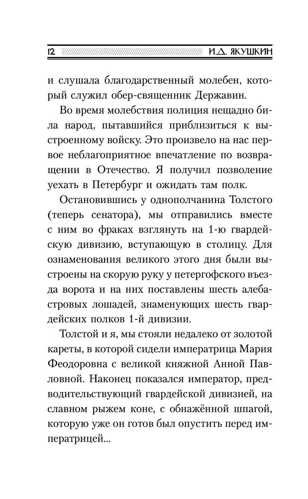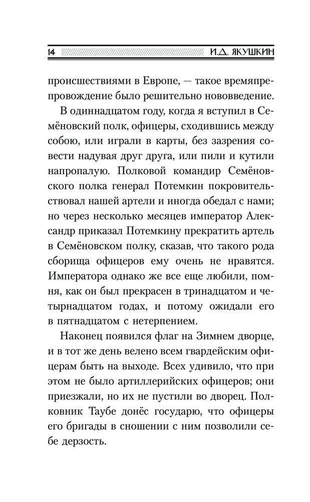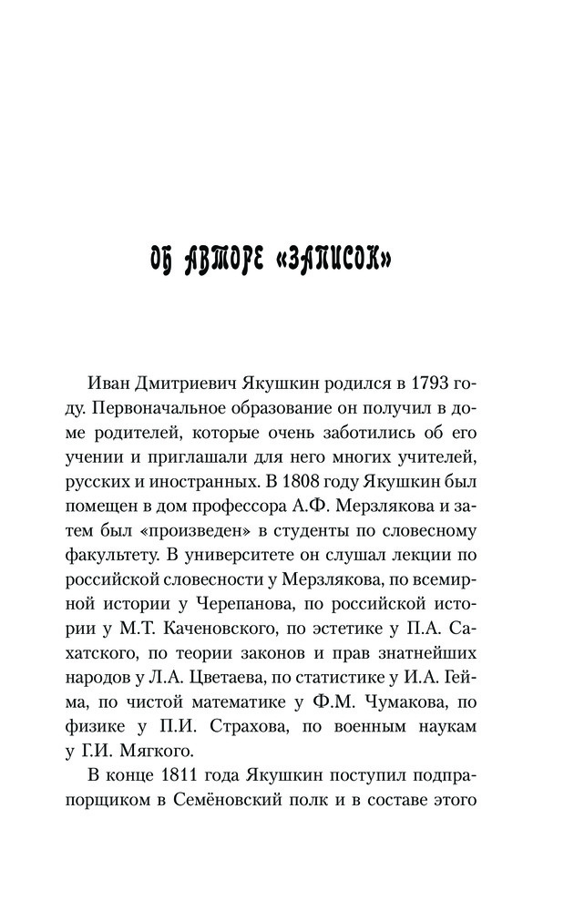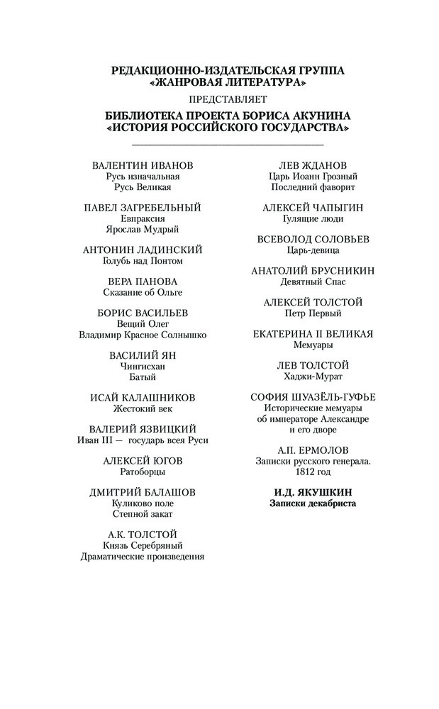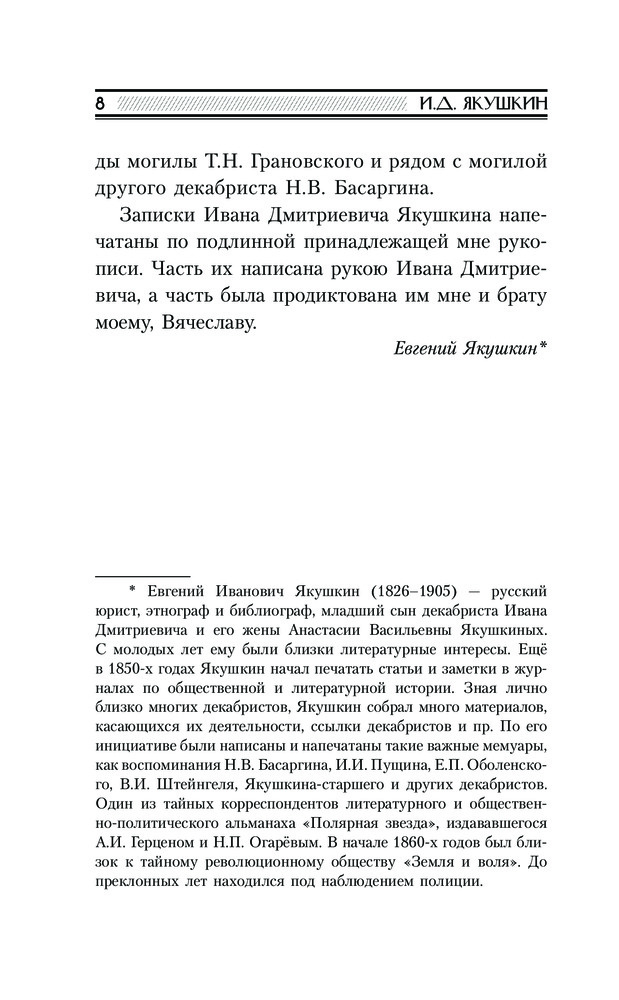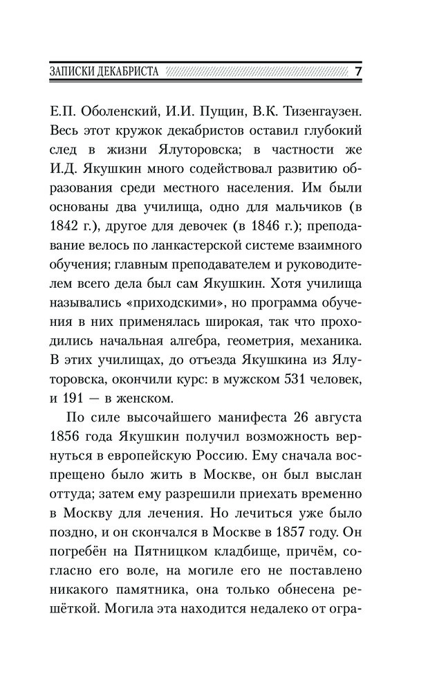 Записки декабристаВ данный момент этот товар отсутствует в продаже. Возможно, у нас найдется аналогичный или похожий товар здесь. Серия: Библиотека проекта Бориса Акунина ИРГ Иван Дмитриевич Якушкин (1793–1857) — один из участников попытки государственного переворота в Санкт-Петербурге в 1825 году. Он отказался присягать Николаю I, был арестован и осужден на 25 лет каторжных работ и поселение. В заключении проявил невероятную стойкость и до конца сохранил верность своим идеалам. В составе гвардейского Семеновского полка будущий декабрист участвовал во всех крупных сражениях 1812–1814 годов. В битве при Бородине был награжден Георгиевским крестом и золотым оружием за храбрость, а за отличие во время заграничной кампании 1813 года — орденом Святой Анны 3-й степени и Кульмским крестом. |