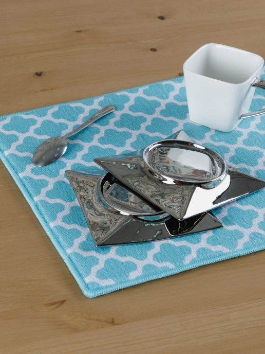 Коврик большой, средней твёрдости, хорошо впитывает влагу при этом не протекает и столешница сухая! Принт приятный и материал не махрит!