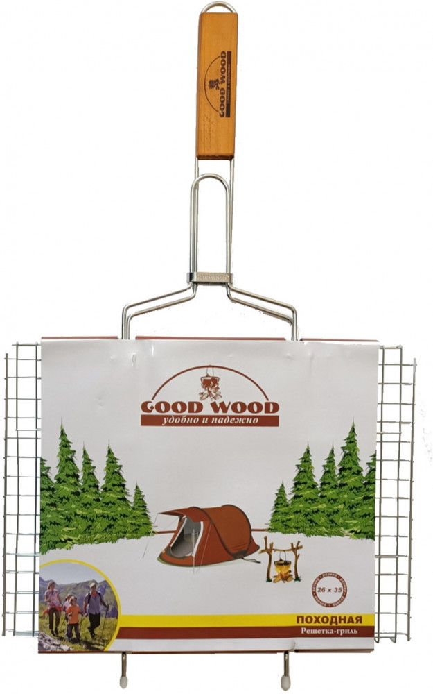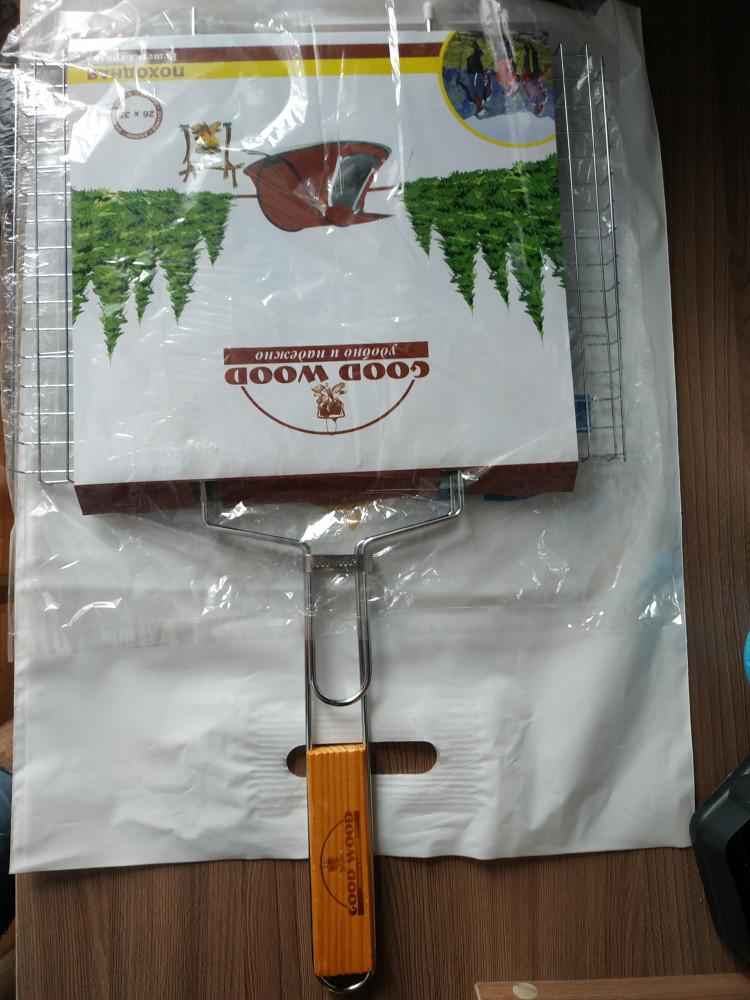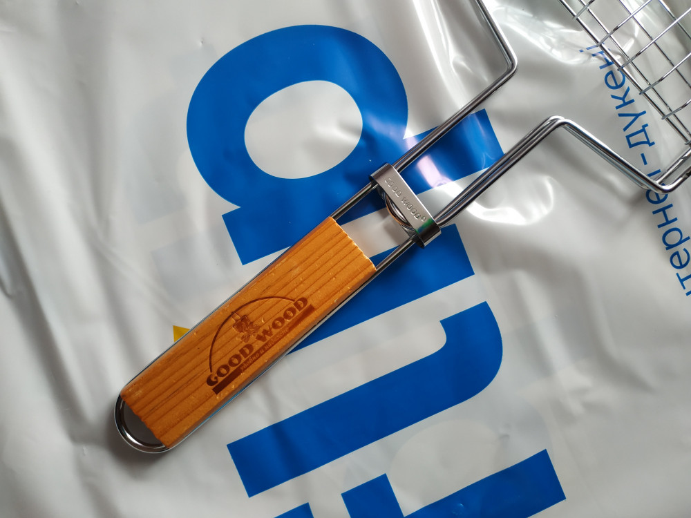 Универсальная хромированная решетка для жарки мяса, рыбы, птицы и овощей-гриль на открытом огне, состоит из двух половин, с кольцом фиксации, ручка из дерева.