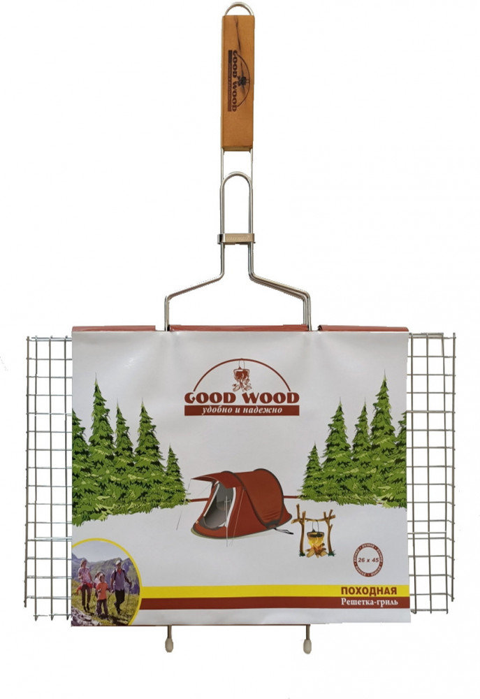 Универсальная хромированная решетка для жарки мяса, рыбы, птицы и овощей-гриль на открытом огне, состоит из двух половин, с кольцом фиксации, ручка из дерева.