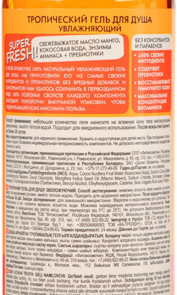 В этой бутылочке 100% натуральный увлажняющий гель для душа. Мы приготовили его из самых свежих ингредиентов и пребиотиков без вредных добавок и консервантов! Нам удалось сохранить в первозданном виде 100% полезных свойств каждого компонента благодаря технологии вакуумной упаковки, чтобы подарить Вашей коже максимум пользы.