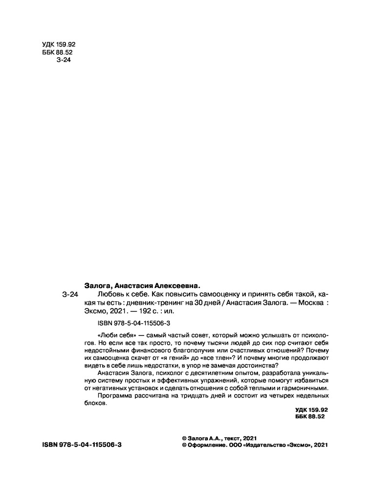 Любовь к себе. Дневник-тренинг на 30 дней. Как повысить самооценку и принять себя такой, какая ты естьВ данный момент этот товар отсутствует в продаже. Возможно, у нас найдется аналогичный или похожий товар здесь. Серия: Книги-тренинги для счастливых перемен «Люби себя» — самый частый совет, который можно услышать от психологов. Но если все так просто, то почему тысячи людей до сих пор считают себя не достойными финансового благополучия или счастливых отношений? Почему их самооценка скачет от «я гений» до "все тлен? И почему многие продолжат видеть в себе лишь недостатки, в упор не замечая достоинства? |