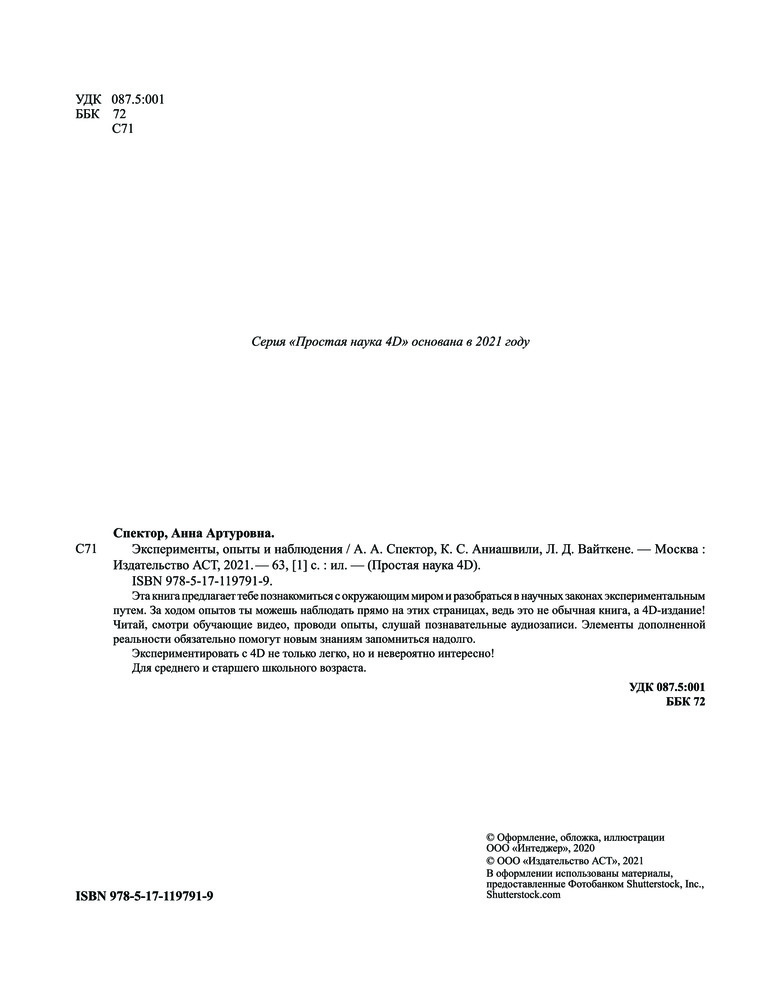 💳 Оплатить за товар можно при получении 🇰🇿 Есть бесплатная доставка по Казахстану от 1 дня 🎁 Копите бонусы с каждой покупки Серия: Простая наука 4D Эта книга предлагает тебе познакомиться с окружающим миром и разобраться в научных законах экспериментальным путем. За ходом опытов ты можешь наблюдать прямо на этих страницах, ведь это не обычная книга, а 4D-издание! Читай, смотри обучающие видео, проводи опыты, слушай познавательные аудиозаписи. Элементы дополненной реальности обязательно помогу новым знаниям запомниться надолго. |