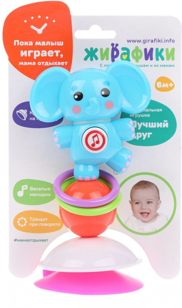 Жирафики Игрушка на присоске «Слоник»В данный момент этот товар отсутствует в продаже. Возможно, у нас найдется аналогичный или похожий товар здесь. Забавная музыкальная игрушка «Слоник» станет лучшим маминым помощником во время кормления малыша! Благодаря присоске её можно надёжно зафиксировать на столе, и она будет проигрывать весёлые мелодии, развлекая маленького непоседу. А ещё малыш может трогать игрушку, и она будет очень приятно греметь, а если покрутить, можно услышать веселую трещотку! |