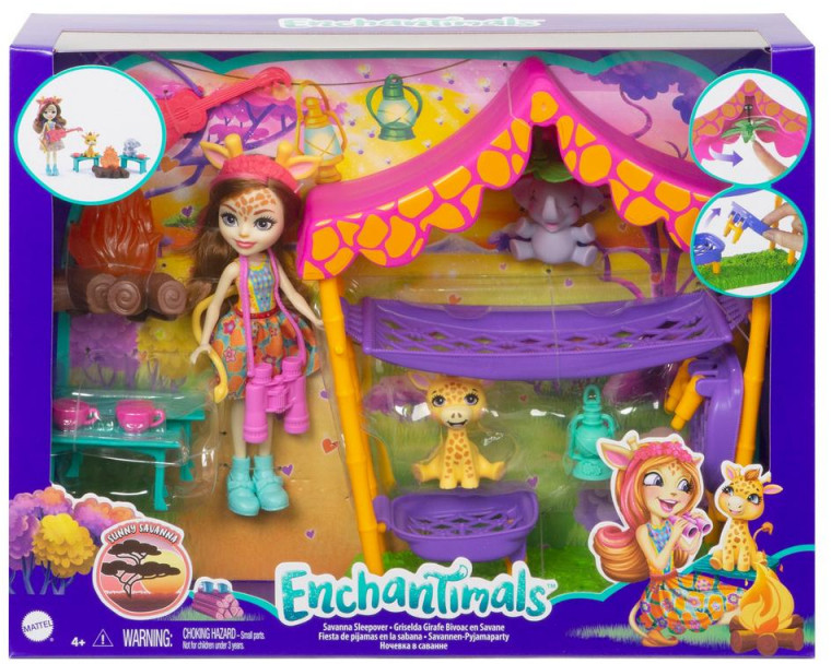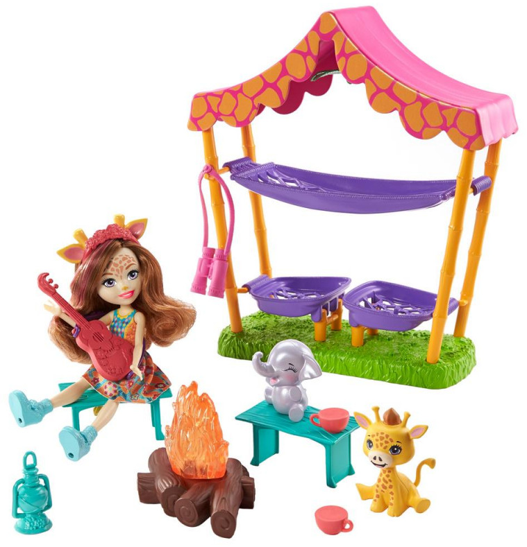 Отправьтесь в Солнечную Саванну вместе с Гризельдой Жираффи и ее питомцами! С игровым набором Enchantimals вы переживете настоящее приключение и проведете незабываемую ночь на природе. Хорошенько поужинайте, а затем устройте веселые посиделки с гитарой у костра. После чудесного вечера кукла и зверюшки Enchantimals отправятся смотреть сладкие сны в палатку. В комплекте много всего интересного для увлекательной игры: палатка с двумя гамаками для малышей-питомцев, очень красивый костер с огнем, гитара, чашки, бинокль и другие мелочи.