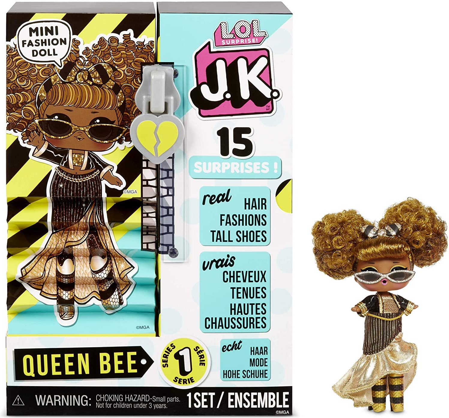 Кукла «LOL J.K. Queen Bee» — это мини копия куклы ЛОЛ ОМГ Роял Би. Кукла ЛОЛ Квин Би J.K. идет с настоящими каштановыми волосами и пышной прической. У куколки карие глаза с золотыми тенями над глазами и голубые губки, а у старшей сестры губы были с накрашены золотистой помадой. Изначально куколка идет с золотым топом и золотыми носочками.