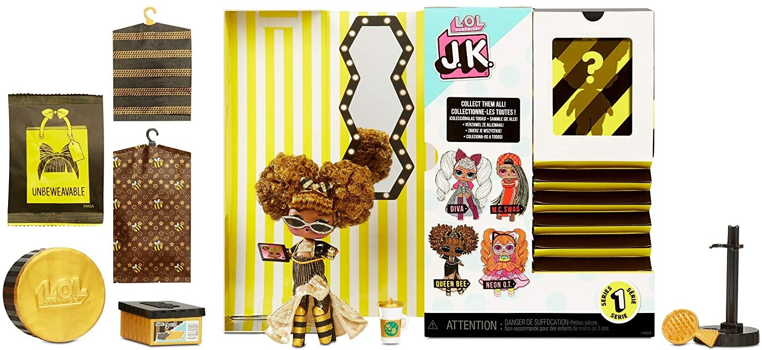 Одежда этой куколки очень схожа с одеждой ее старшей сестры. Куколка «LOL J.K. Queen Bee» меняет свой цвет, если опустить куколку в холодную воду на ее золотом костюмчике проявятся черные полосы, а в теплой воде они исчезают. Открыв коробку — гардеробную, мы обнаружим: вешалки с модными нарядами и коробки с обувью и аксессуарами. В первом чехле черная кожаная куртка с золотым обрамлением. Во втором чехле золотая, блестящая юбка. Наряд очень похож на наряд старшей сестры «LOL OMG Royal Bee». Открыв коробочку, нам попадется черно-золотые ботинки с золотыми блестками и на очень высокой платформе.