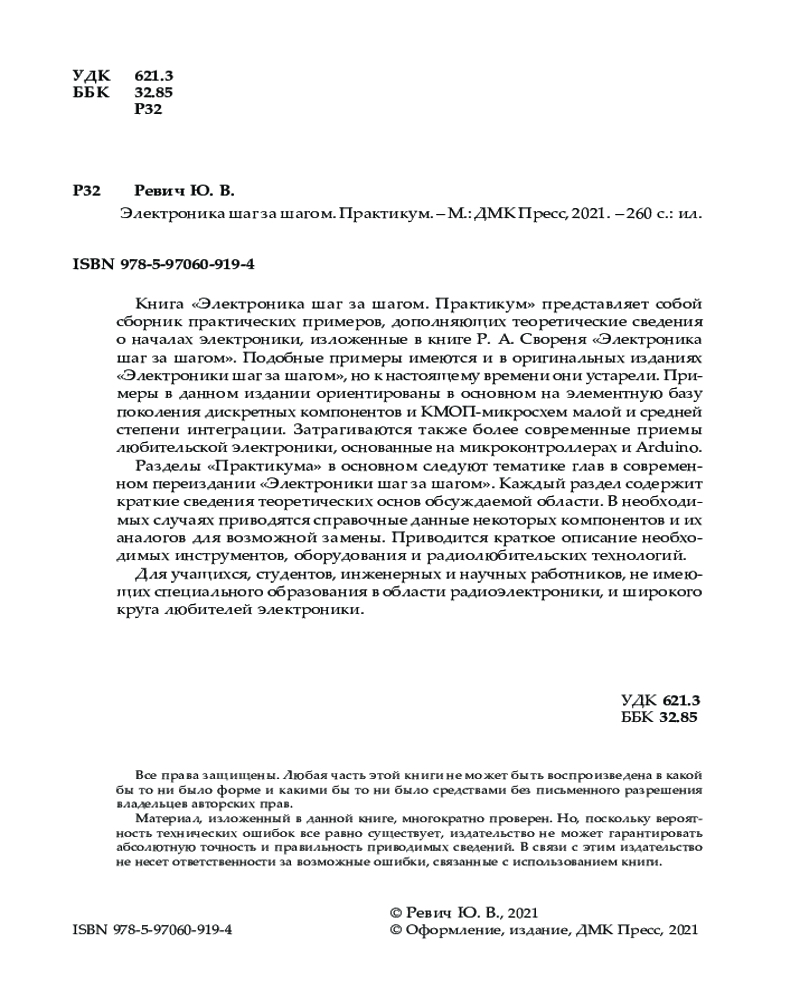 💳 Оплатить за товар можно при получении 🇰🇿 Есть бесплатная доставка по Казахстану от 1 дня 🎁 Копите бонусы с каждой покупки Книга «Электроника шаг за шагом. Практикум» представляет собой сборник практических примеров, дополняющих теоретические сведения о началах электроники, изложенные в книге Р. А. Свореня «Электроника шаг за шагом». Подобные примеры имеются и в оригинальных изданиях «Электроники шаг за шагом», но к настоящему времени они устарели. Примеры в данном издании ориентированы в основном на элементную базу поколения дискретных компонентов и КМОП-микросхем малой и средней степени интеграции. Затрагиваются также более современные приемы любительской электроники, основанные на микроконтроллерах и Arduino. |