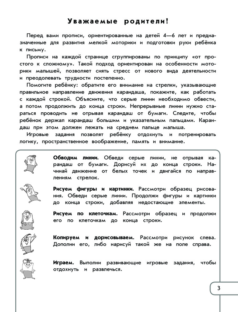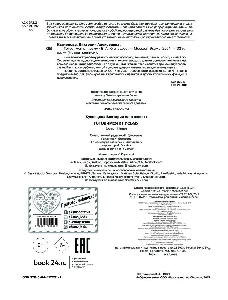 💳 Оплатить за товар можно при получении 🇰🇿 Есть бесплатная доставка по Казахстану 🎁 Копите бонусы с каждой покупки Серия: Новые прописи (обложка) Книга поможет ребёнку развить мелкую моторику, внимание, память, логику и смекалку. Современная методика подготовки руки к письму предусматривает совмещение нового материала и заданий на закрепления с обучающими играми, чтобы занятия приносили удовольствие. Регулярная работа с книгой поможет довести навыки письма до автоматизма. |