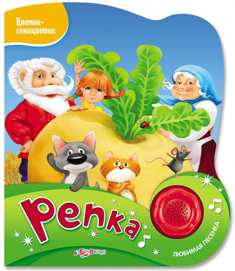Добрая сказка «Репка» с яркими персонажами и красочными картинками не оставит малышей равнодушными. А при нажатии на кнопочку-цветочек зазвучит весёлая песенка про репку. |