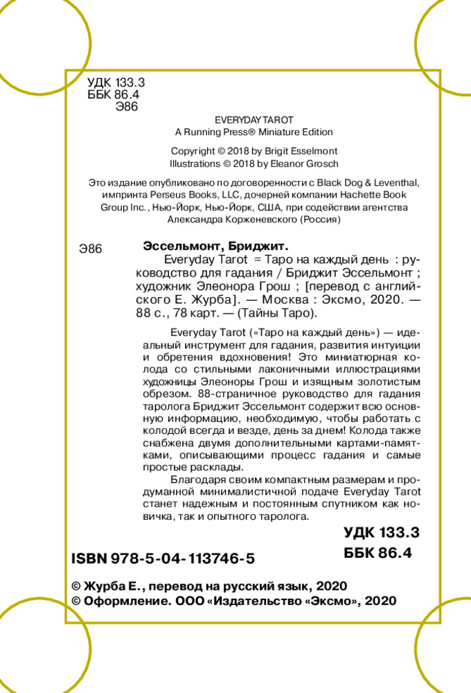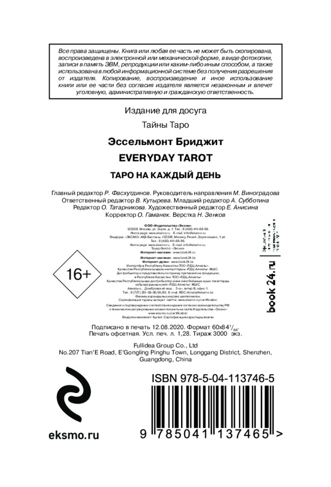 💳 Оплатить за товар можно при получении 🇰🇿 Есть бесплатная доставка по Казахстану от 1 дня 🎁 Копите бонусы с каждой покупки Серия: Карты для гаданий. Таро Everyday Tarot («Таро на каждый день») — идеальный инструмент для гадания, развития интуиции и обретения вдохновения! Это миниатюрная колода со стильными лаконичными иллюстрациями художницы Элеоноры Грош и изящным золотистым обрезом. 88-страничное руководство для гадания таролога Бриджит Эссельмонт содержит всю основную информацию, необходимую, чтобы работать с колодой всегда и везде, день за днем! Колода также снабжена двумя дополнительными картами-памятками, описывающими процесс гадания и самые простые расклады. |