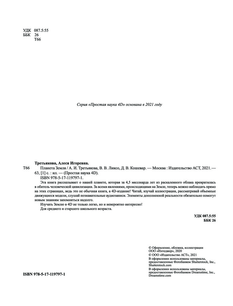 Планета ЗемляДмитрий Васильевич Кошевар, Алеся Игоревна Третьякова, Вячеслав Владимирович Ликсо В данный момент этот товар отсутствует в продаже. Возможно, у нас найдется аналогичный или похожий товар здесь. Серия: Простая наука 4D Эта книга рассказывает о нашей планете, которая за 4,5 миллиарда лет из раскаленного облака превратилась в обитель человеческой цивилизации. За всеми явлениями, происходящими на Земле, теперь можно наблюдать прямо на этих страницах, ведь это не обычная книга, а 4D-издание! Читай, изучай иллюстрации, рассматривай объемные движущиеся модели, слушай познавательные аудиозаписи. Элементы дополненной реальности обязательно помогут новым знаниям запомниться надолго. |