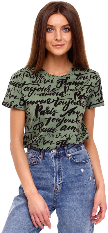 Цвет все- таки чуть более зелено-травяной,чем оливковый,но это футболку не портит. Трикотаж плотный,форму держит хорошо,майка не висит и не в обтяг. Надписи выглядят не аляповато. Идёт в размер.