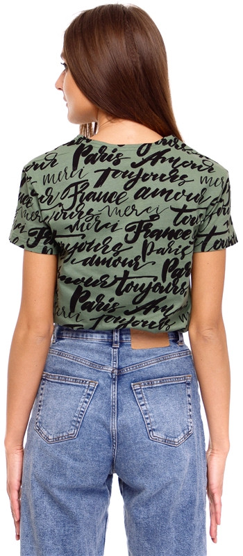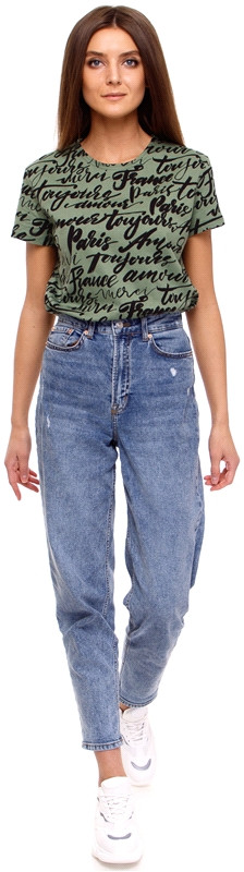 Футболка выполнена из легкого хлопкового полотна. Изделие свободного покроя с короткими рукавами и округлым вырезом горловины.