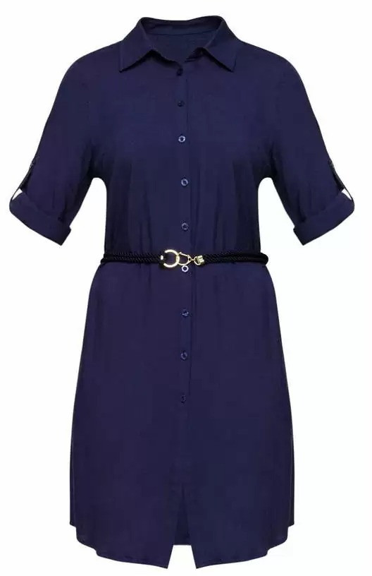 Длинное платье-рубашка свободного прямого кроя на пуговицах, стояче-отложной воротник. Длина до уровня колен. Декоративный пояс с золотым аксессуаром.