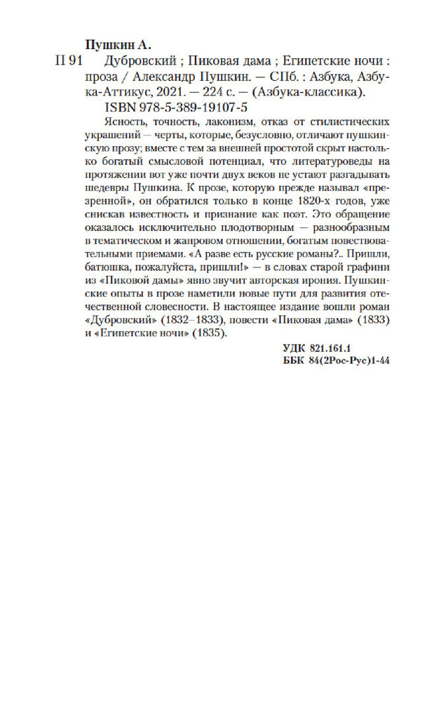 💳 Оплатить за товар можно при получении 🇰🇿 Есть бесплатная доставка по Казахстану от 1 дня 🎁 Копите бонусы с каждой покупки Серия: Азбука-Классика Ясность, точность, лаконизм, отказ от стилистических украшений — черты, которые, безусловно, отличают пушкинскую прозу; вместе с тем за внешней простотой скрыт настолько богатый смысловой потенциал, что литературоведы на протяжении вот уже почти двух веков не устают разгадывать шедевры Пушкина. К прозе, которую прежде называл «презренной», он обратился только в конце 1820-х годов, уже снискав известность и признание как поэт. Это обращение оказалось исключительно плодотворным — разнообразным в тематическом и жанровом отношении, богатым повествовательными приемами. «А разве есть русские романы?.. Пришли, батюшка, пожалуйста пришли», — в словах старой графини из «Пиковой дамы» явно звучит авторская ирония. Пушкинские опыты в прозе наметили новые пути для развития отечественной словесности. В настоящее издание вошли роман «Дубровский» (1832–1833), повести «Пиковая дама» (1833) и «Египетские ночи» (1835). |