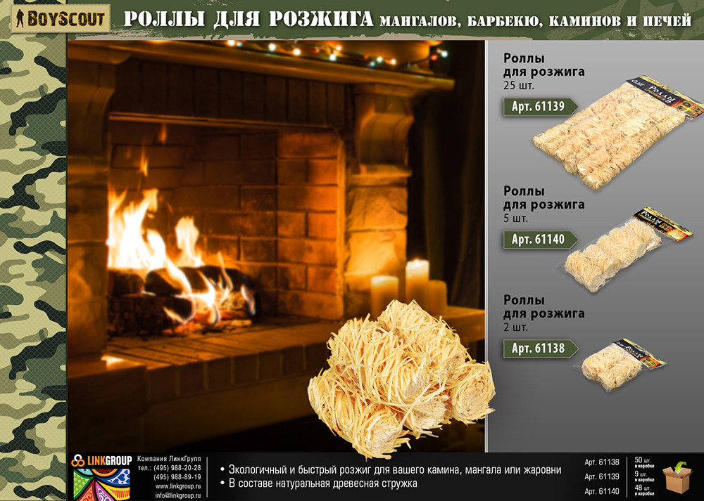 Boyscout Роллы для розжига мангалов, барбекю, каминов и печейВ данный момент этот товар отсутствует в продаже. Возможно, у нас найдется аналогичный или похожий товар здесь. С помощью различных принадлежностей для розжига «Boyscout» растопка гриля, котла, печи, бани, камина станет простым и безопасным делом. Брикетированный уголь, топливные брикеты и роллы для розжига, поленья длительного горения — это удобные и практичные средства для дачников, туристов, рыбаков и охотников — всех кому нужно быстро и без проблем развести огонь. Какое бы средство для розжига Вы ни выбрали, оно станет Вашим верным помощником в организации отдыха на природе. |