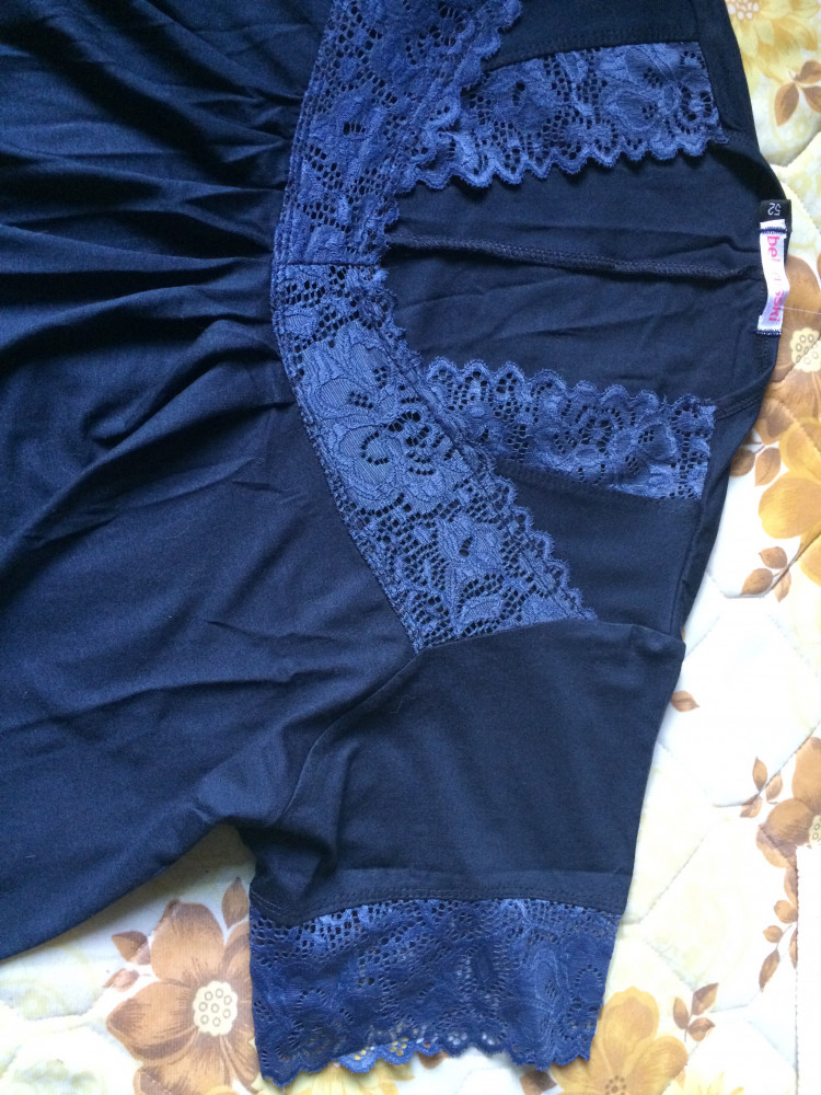 Качество трикотажа, пошива и кружева хорошее. Приятное к телу, цвет брала синий, понравился, соответствует фото на сайте, но фасон для более возрастных женщин.