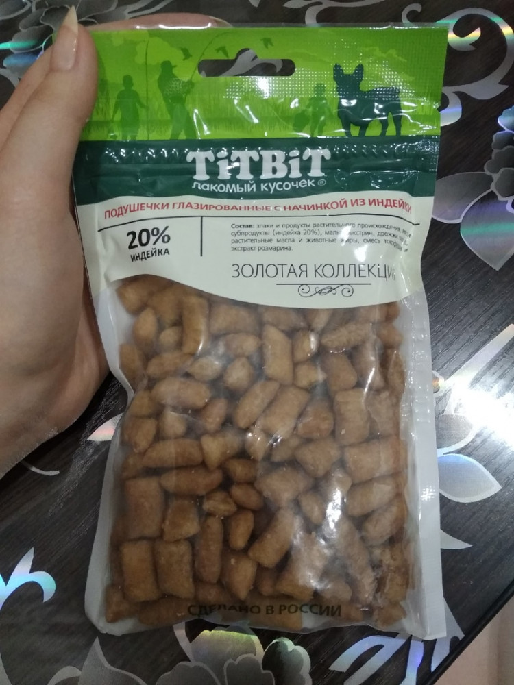 Для мини Йорка они велики, но поломав подушечку, собака уплетала с удовольствием.