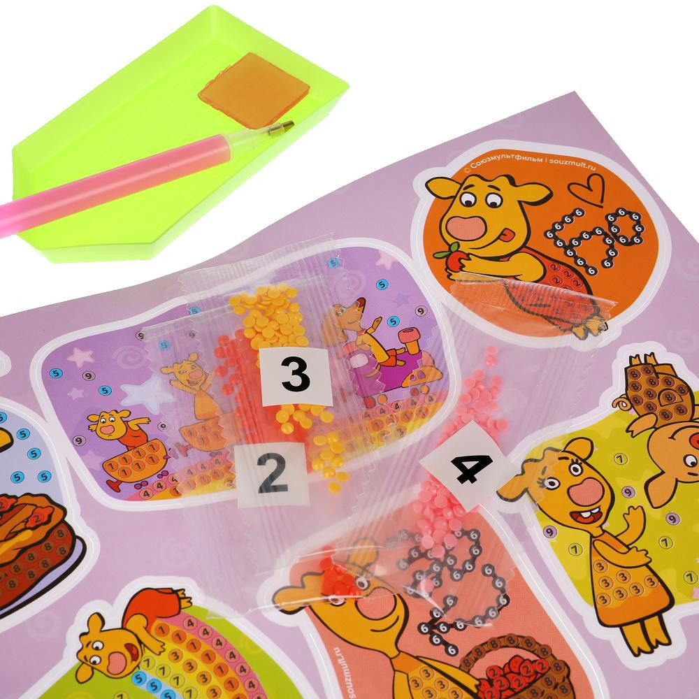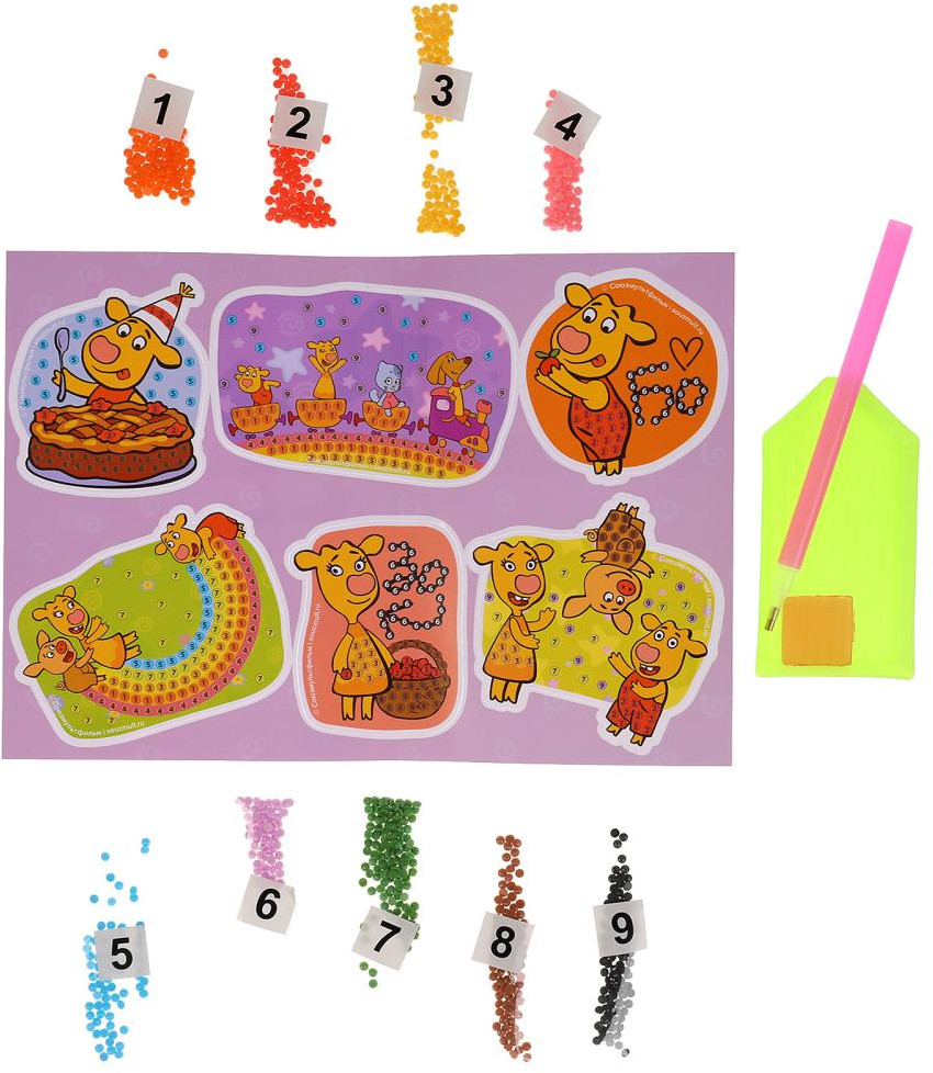 С помощью красочных основ и разноцветных сверкающих страз маленький любознайка сможет самостоятельно создать 6 небольших ярких картинок-стикеров с изображением любимых персонажей, которыми можно украсить, например, чехол для телефона, сумку, цветочный горшок и т.п.