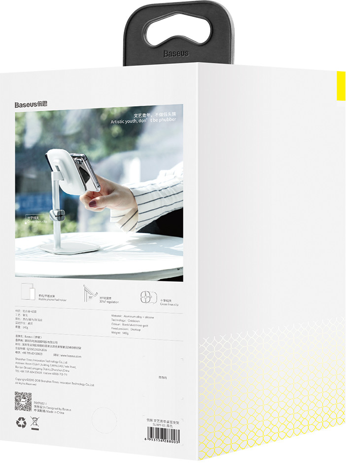 В «Baseus Literary Youth Desktop Bracket» использовано специальное покрытие, которое исключит появление царапин и потертостей на корпусе смартфона. Конструкция держателя выполнена таким образом, чтобы исключить вероятность падения устройства. Также в модели имеется органайзер для проводов, в котором можно зафиксировать кабель зарядки.