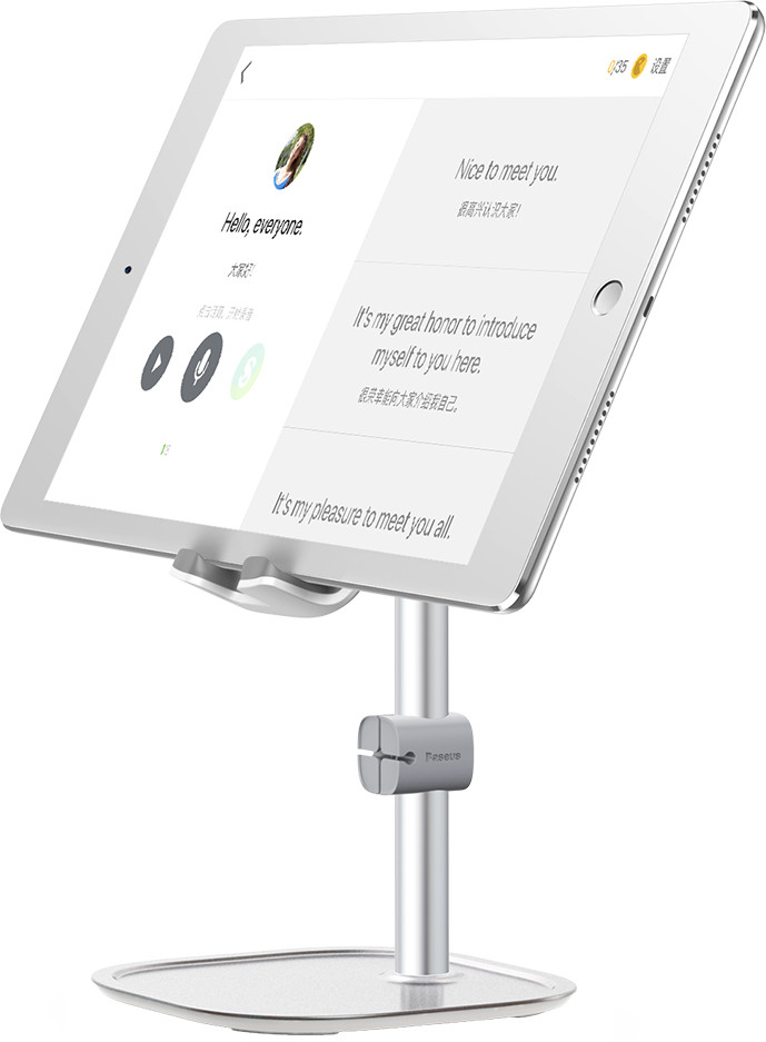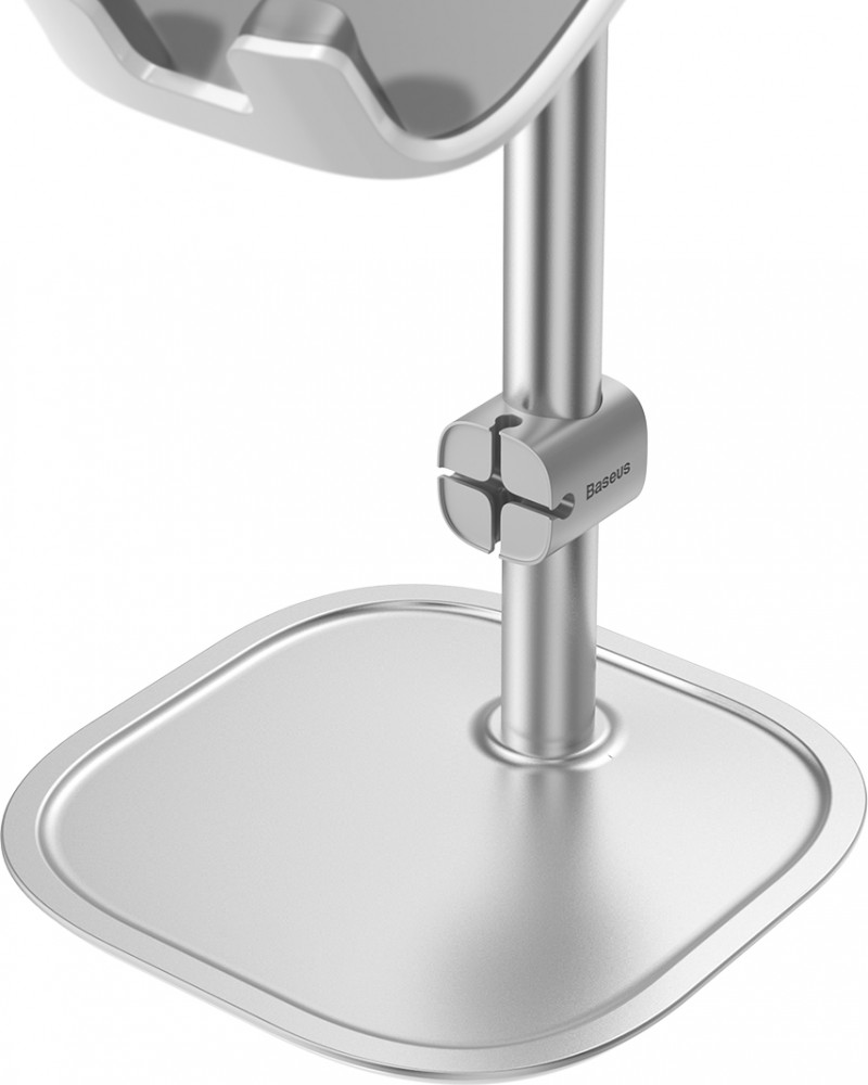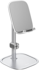 Держатель «Baseus Literary Youth Desktop Bracket» выполнен из прочного алюминия, а устойчивость конструкции обеспечена широкой платформой, которая также служит для хранения различных аксессуаров. В днище держателя использованы резиновые накладки, благодаря чему он не оставляет следов на покрытии стола или тумбы.